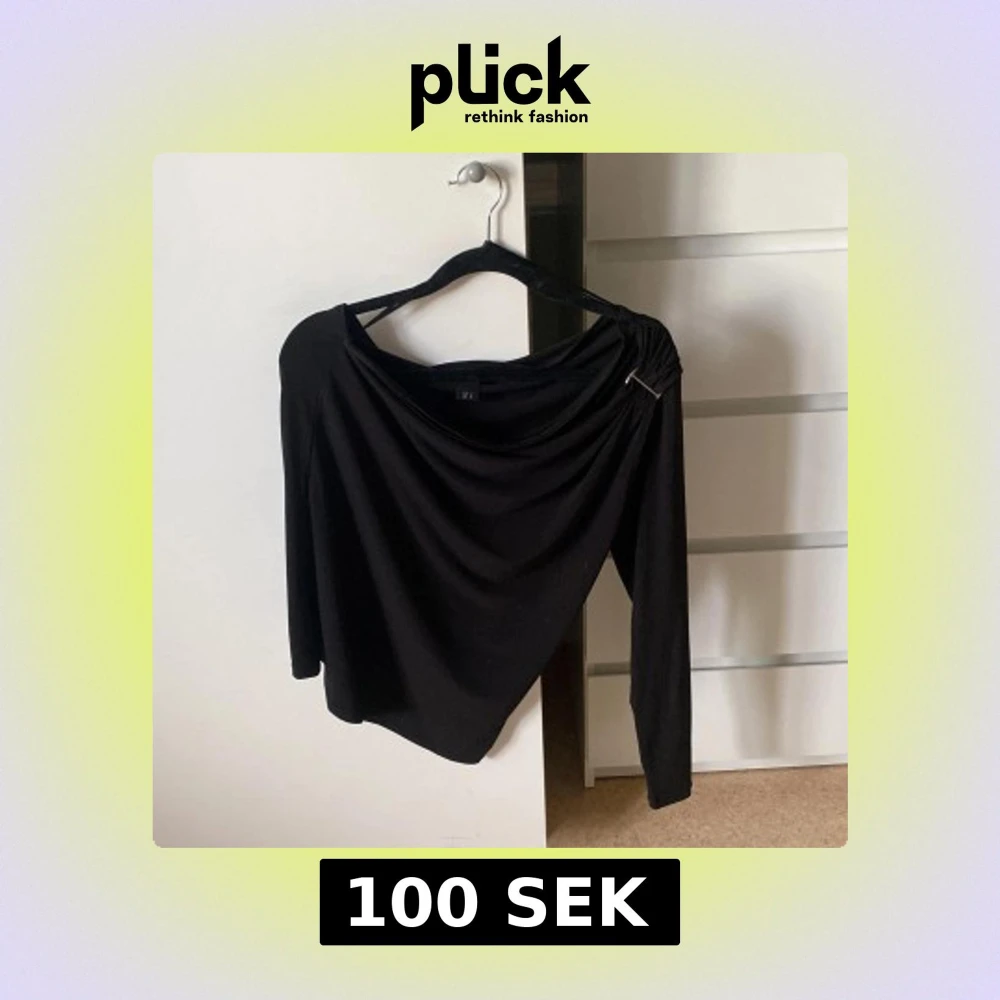 Säljer en svart långärmad topp med snygg drapering och en metall-detalj på ena axeln. Toppen är tillverkad i ett mjukt, stretchigt material som sitter skönt på kroppen. Perfekt för dig som gillar en stilren men ändå unik look. Obs! Sitter inte så snett som den hänger på bilderna.