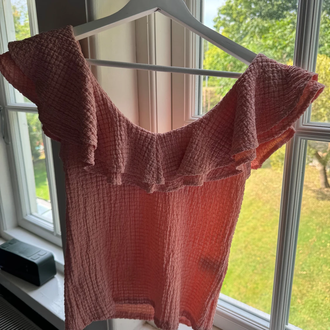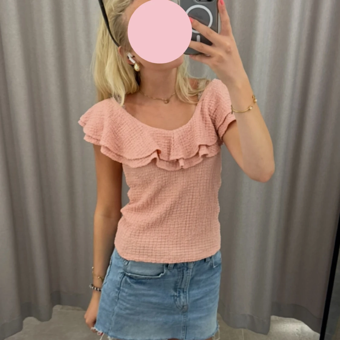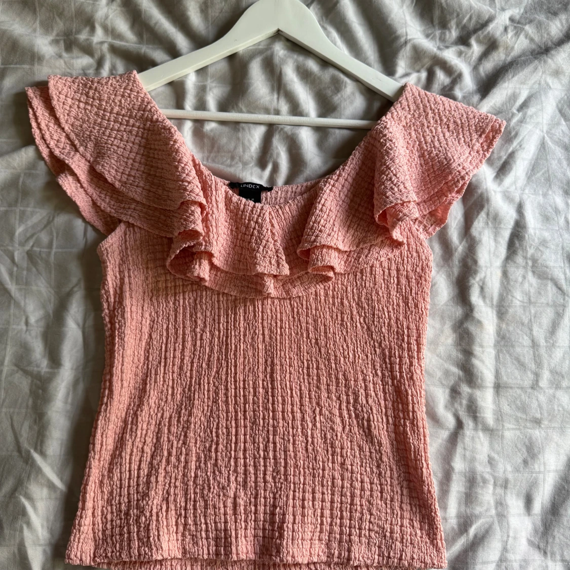 Supersöt ljusrosa topp från Lindex med volangdetaljer längs den vida urringningen. Toppen är ärmlös och har en strukturerad, lite krinklad bomullskänsla. Perfekt till jeanskjol eller shorts för en fräsch sommarlook!