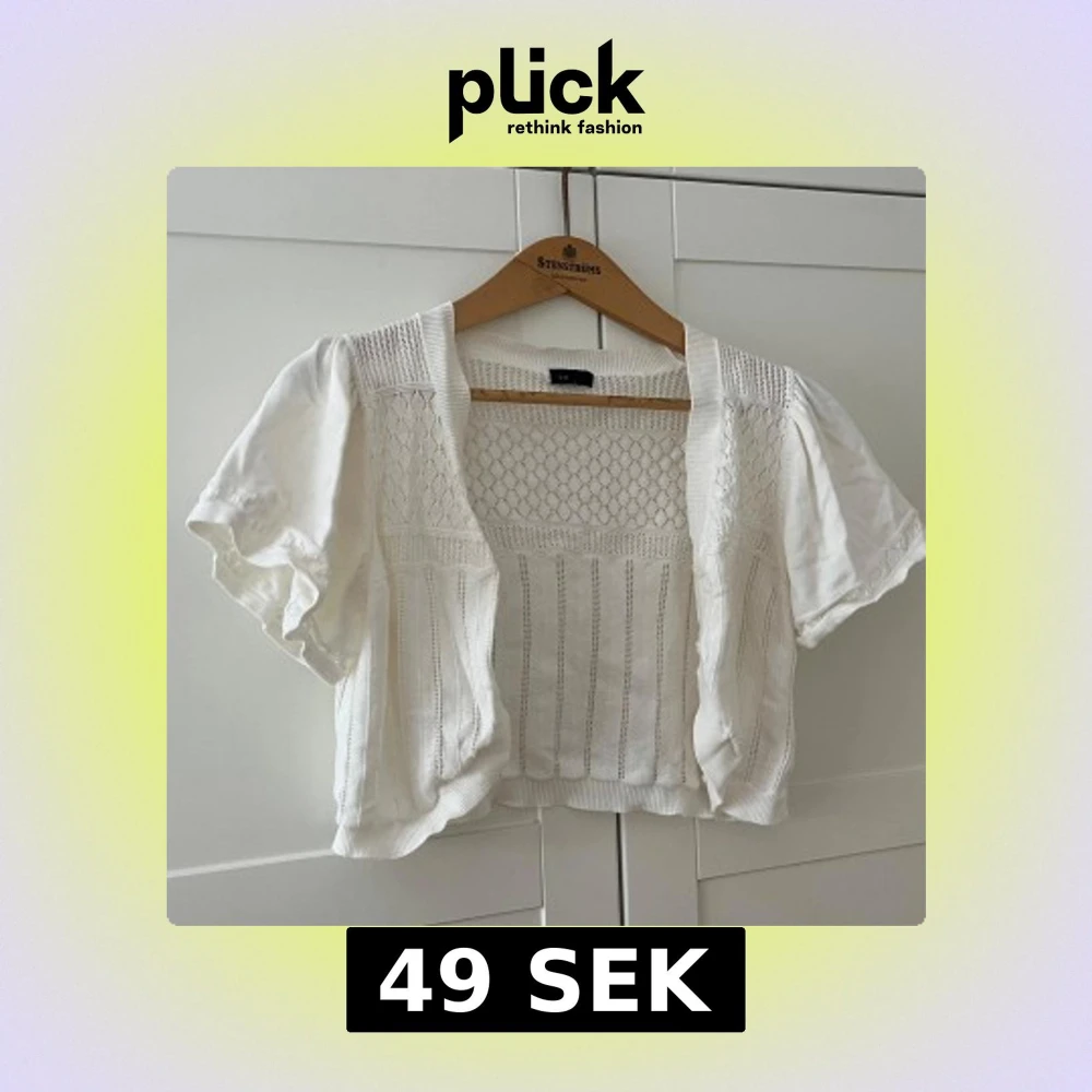 Supersöt vit bolerotopp från Lindex med korta puffärmar och stickade detaljer. Toppen har öppen front, vackert hålmönster och ribbade kanter. Perfekt att slänga över ett linne eller klänning för en extra touch.