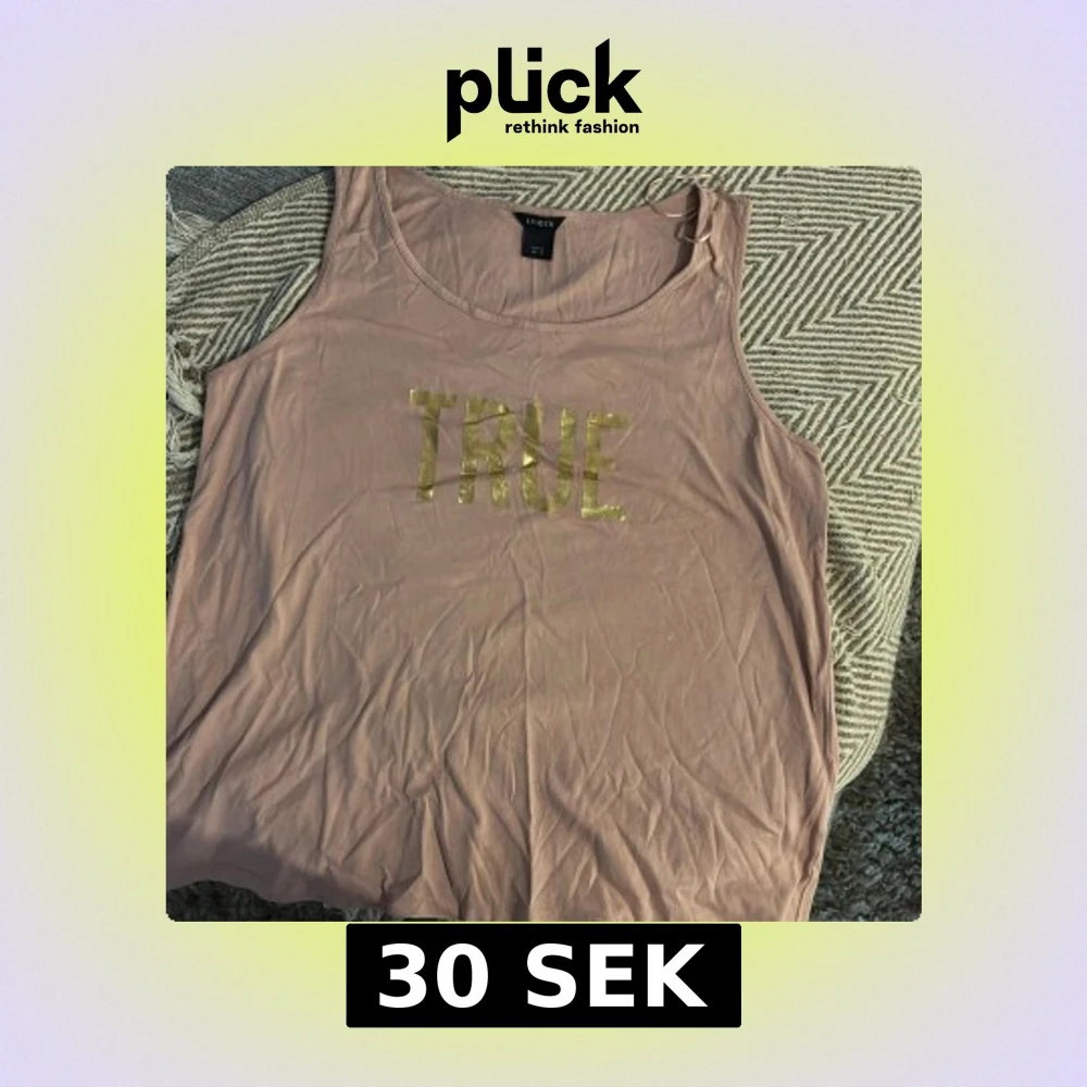 Säljer en beige ärmlös linnetopp från Lindex i storlek M. Toppen har ett stort tryck med ordet 'TRUE' i glansig guldtext framtill. Mjuk och tunn bomullskänsla, perfekt för varma dagar eller lager på lager.