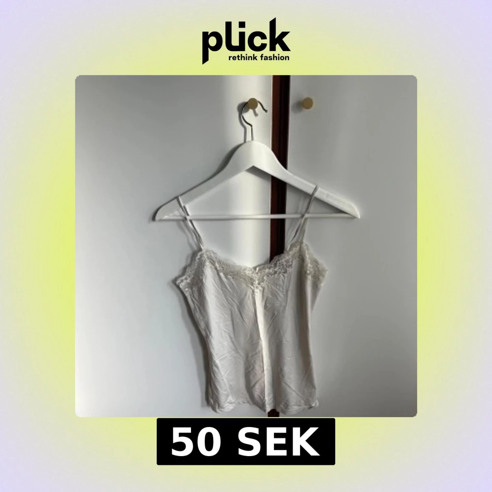 Säljer en söt vit linnetopp från Lindex med tunna axelband och fina spetsdetaljer längs urringningen.