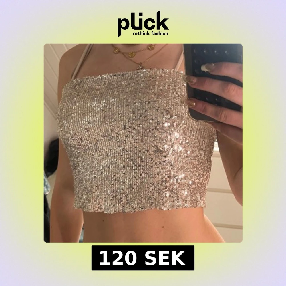 Supersnygg tubtopp från Lindex i silver med massor av paljetter som glittrar i ljuset. Toppen har smala axelband och croppad passform, perfekt för att sticka ut. Mjuk insida för extra komfort.