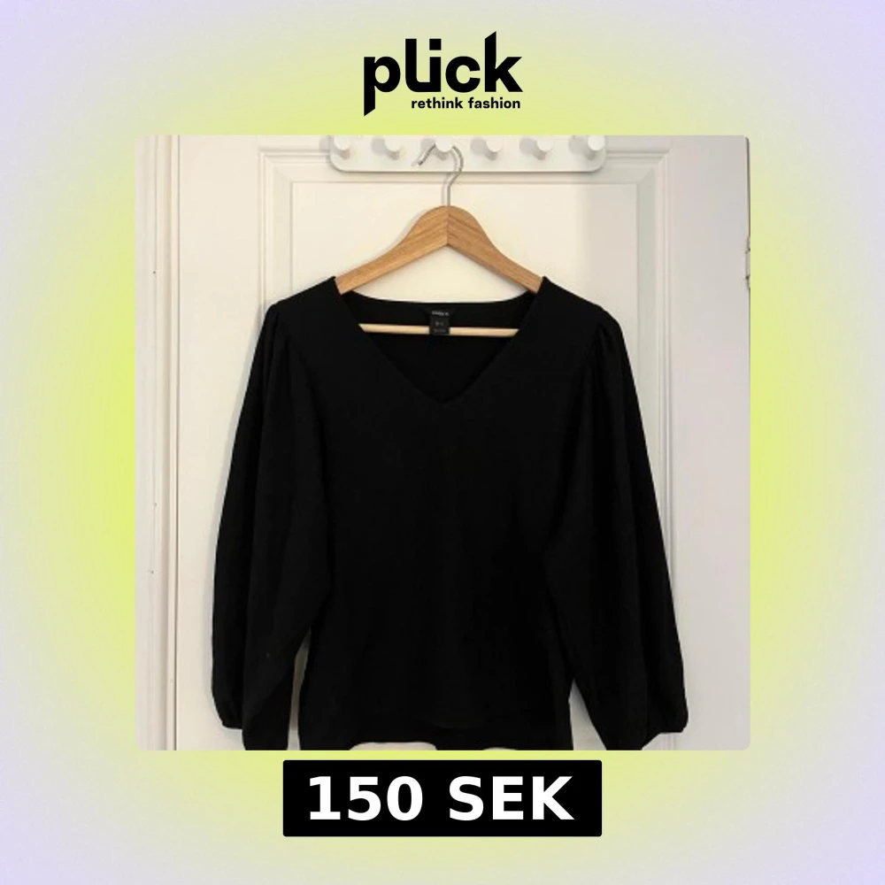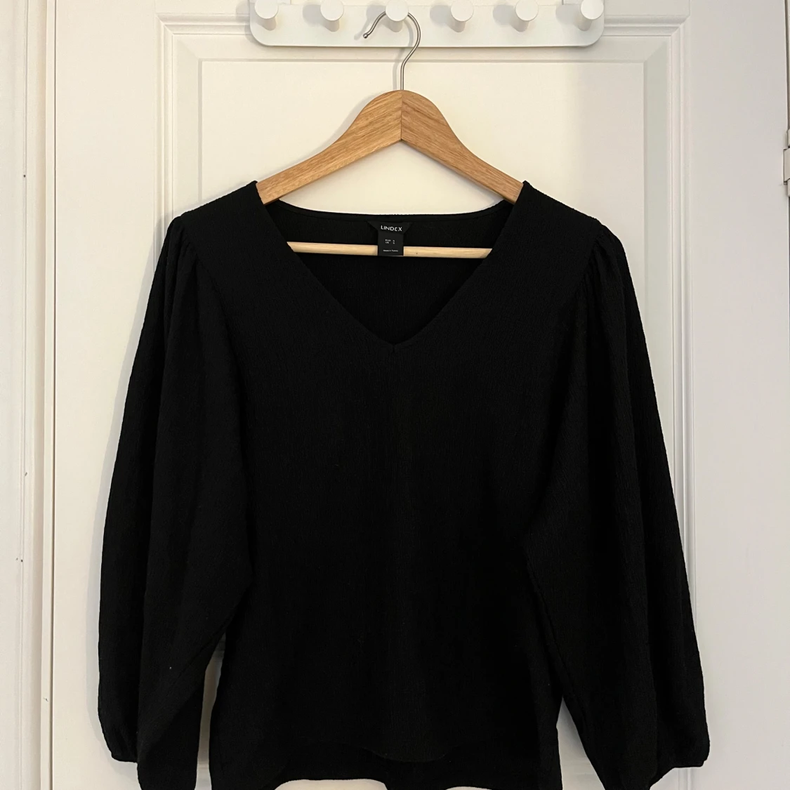 Svart blus från Lindex med v-ringning och långa, lätt puffade ärmar. Enkel och stilren design som passar till många olika looks. Tillverkad i ett mjukt tyg som känns skönt mot huden.