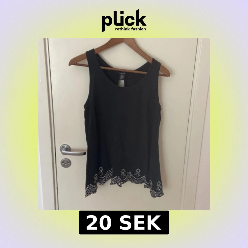 Svart ärmlös linnetopp från Lindex med vit brodyr längs nederkanten och ryggen. Toppen har en snygg öppen detalj i ryggen och vågig kant nertill. Perfekt för dig som gillar unika detaljer och stilren design.