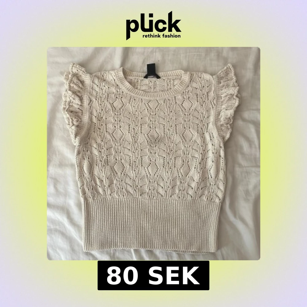 Supersöt stickad topp från Lindex i ljusbeige med volangärmar och snyggt hålmönster. Rund halsringning och bred ribbad nederkant ger en trendig look. Perfekt att styla med jeans eller kjol för en fräsch vibe. En liten fläck mitt på, men den syns inte när den sitter på