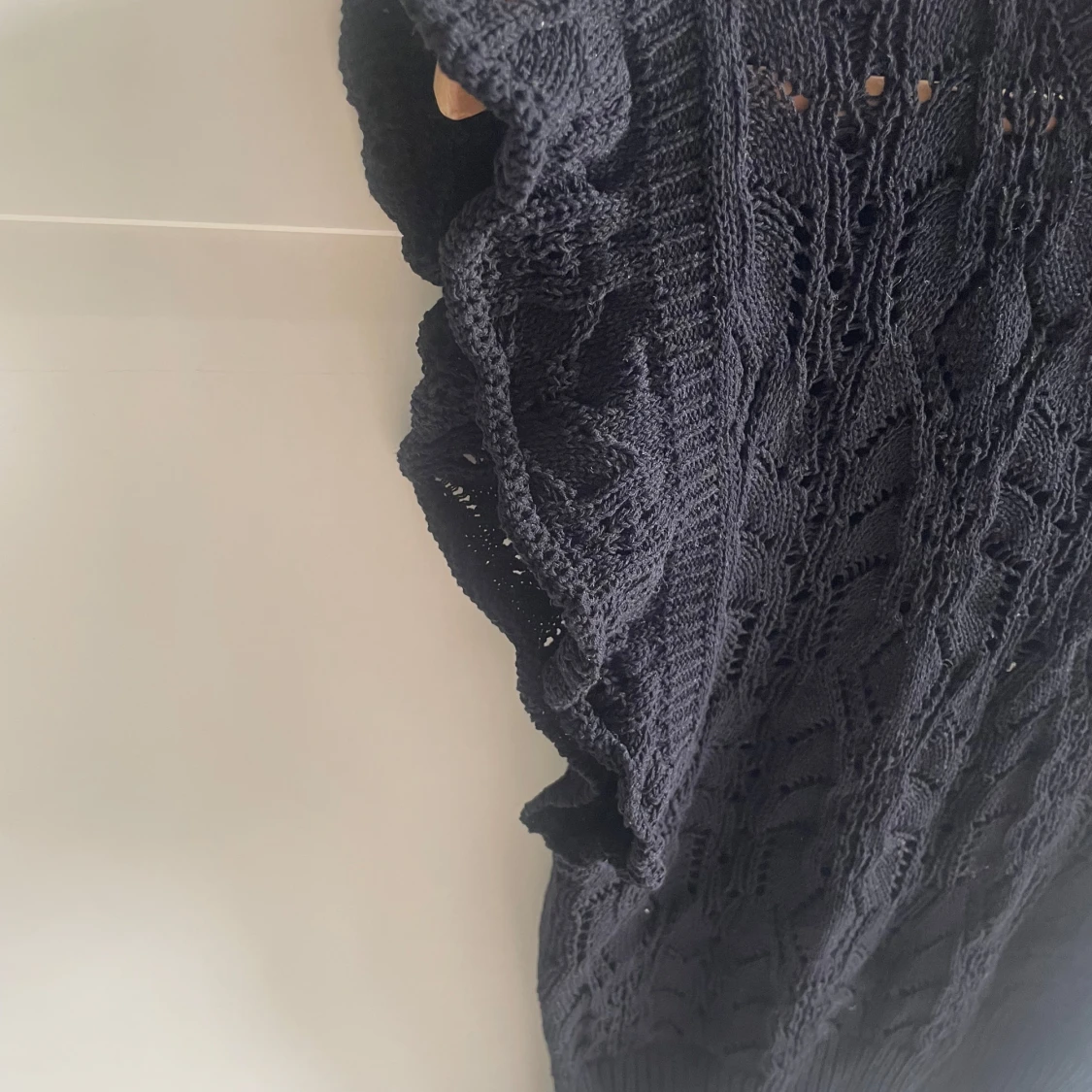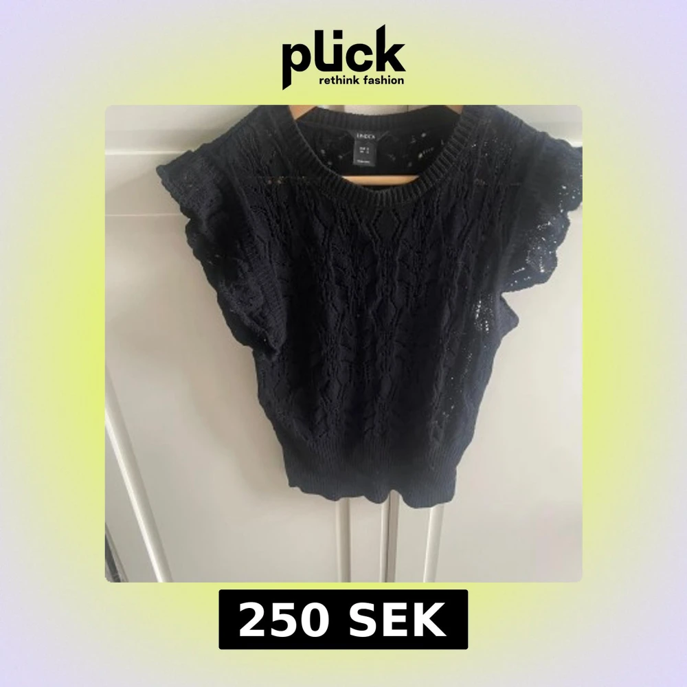 Supersöt svart stickad topp från Lindex i storlek S. Toppen har ett genombrutet mönster, volangliknande ärmar och ribbade kanter. Perfekt för dig som gillar en feminin och trendig look med snygga detaljer.