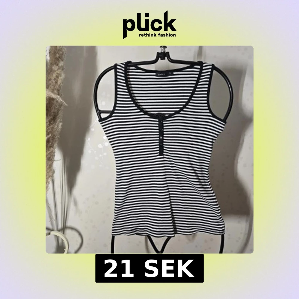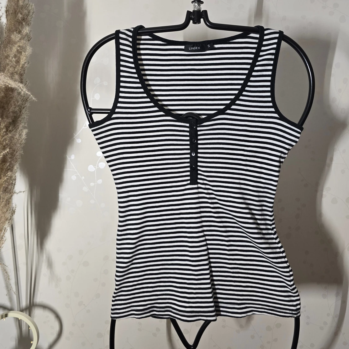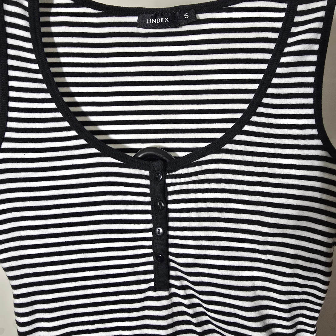 Snygg svartvit randig linnetopp från Lindex i storlek S. Toppen har rund halsringning och knappar framtill som detalj. Tillverkad i mjuk bomull med smal passform och ärmlös design. Perfekt för dig som gillar enkel och stilren look.