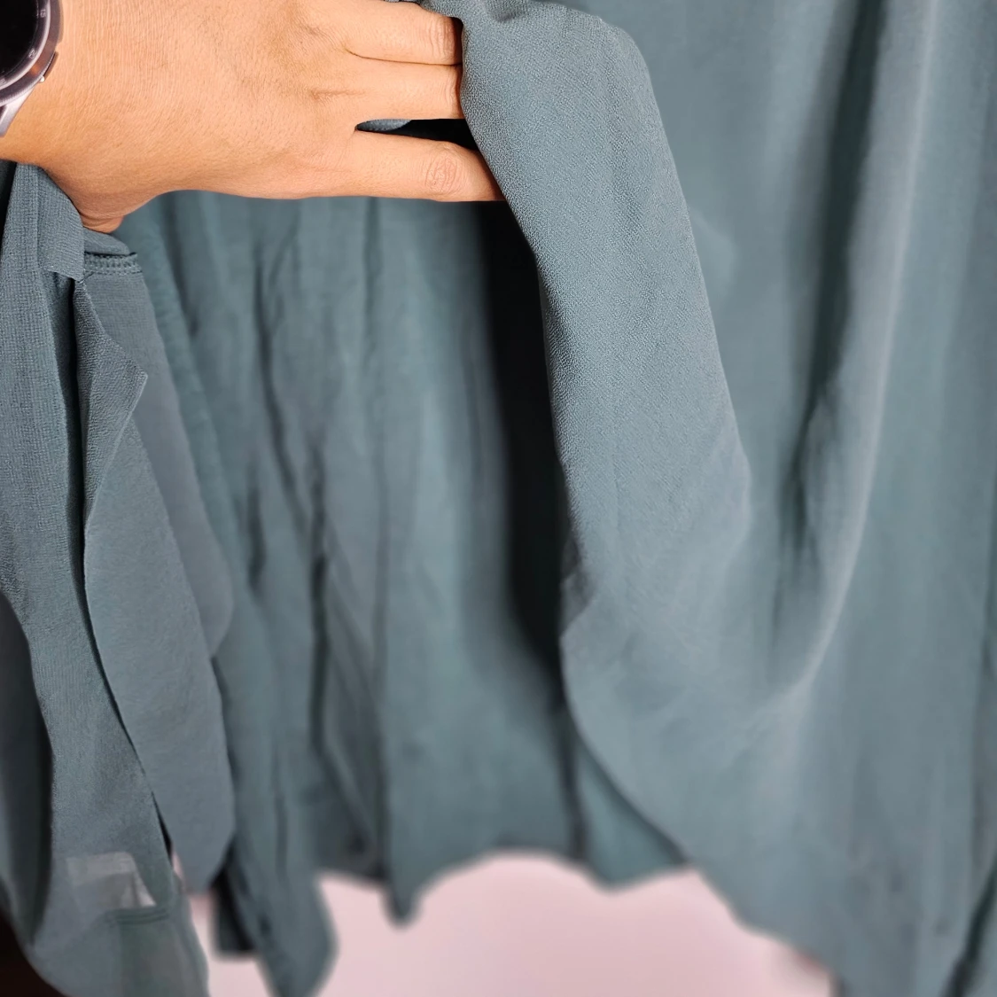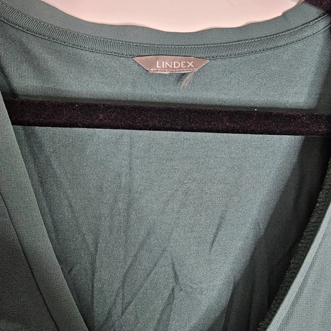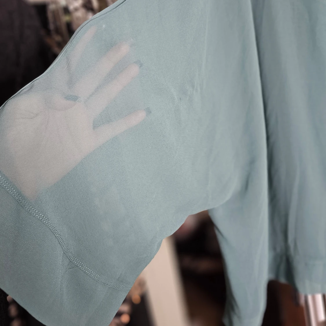 Säljer en luftig grön topp med v-ringning i storlek XL. Den är tillverkad i 100% polyester med ett foder av lyocell och viskos. Den har vida ärmar i mesh men på överkroppen är det en undertröja. Väldigt stilren topp.