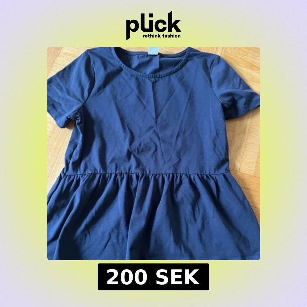 Säljer en mörkblå peplum topp med rund halsringning och korta ärmar. Toppen har en markerad midja med rynkad volang nedtill som ger en snygg siluett. Storlek 158/164