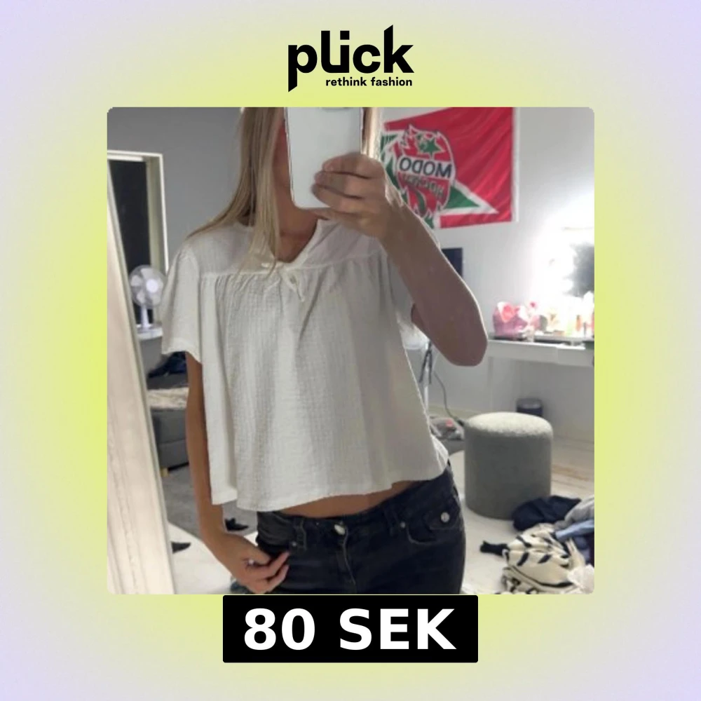 Säljer en söt vit blus med korta ärmar och croppad passform. Toppen har en lätt textur i tyget och en liten knytning vid halsen som ger en gullig detalj. Perfekt att matcha med jeans eller kjol för en fräsch look.