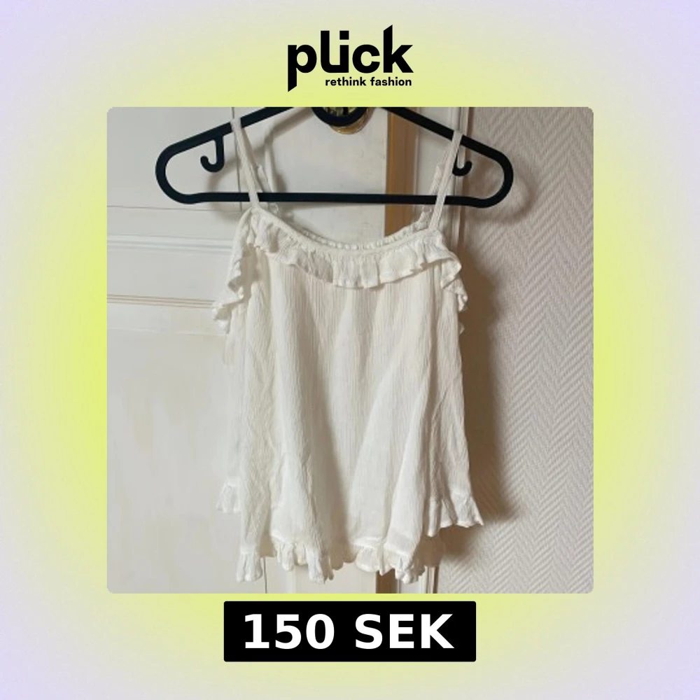 Supersöt vit blus från Lindex med tunna axelband och volangdetaljer längs halsringning och nederkant. Blusen är gjord i ett lätt, krinklat tyg som känns luftigt och perfekt för varma dagar. Xs/s säljer pga att den aldrig kommit till användning