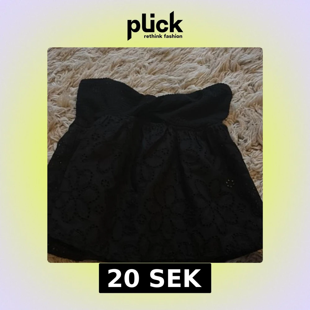 Svart kort axelbandslös klänning med broderade blommor och spetsdetaljer. Överdelen är smockad för en bekväm passform och kjolen har ett fint blommigt mönster i spets. Perfekt för dig som gillar en feminin och trendig stil.