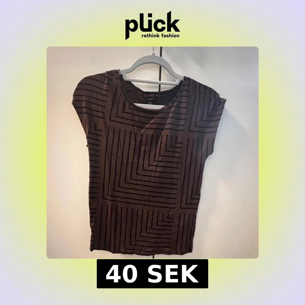 Säljer en brun topp från Lindex med ett geometriskt mönster i svart. Toppen har korta ärmar och en rund halsringning. Perfekt för en stilren look.
