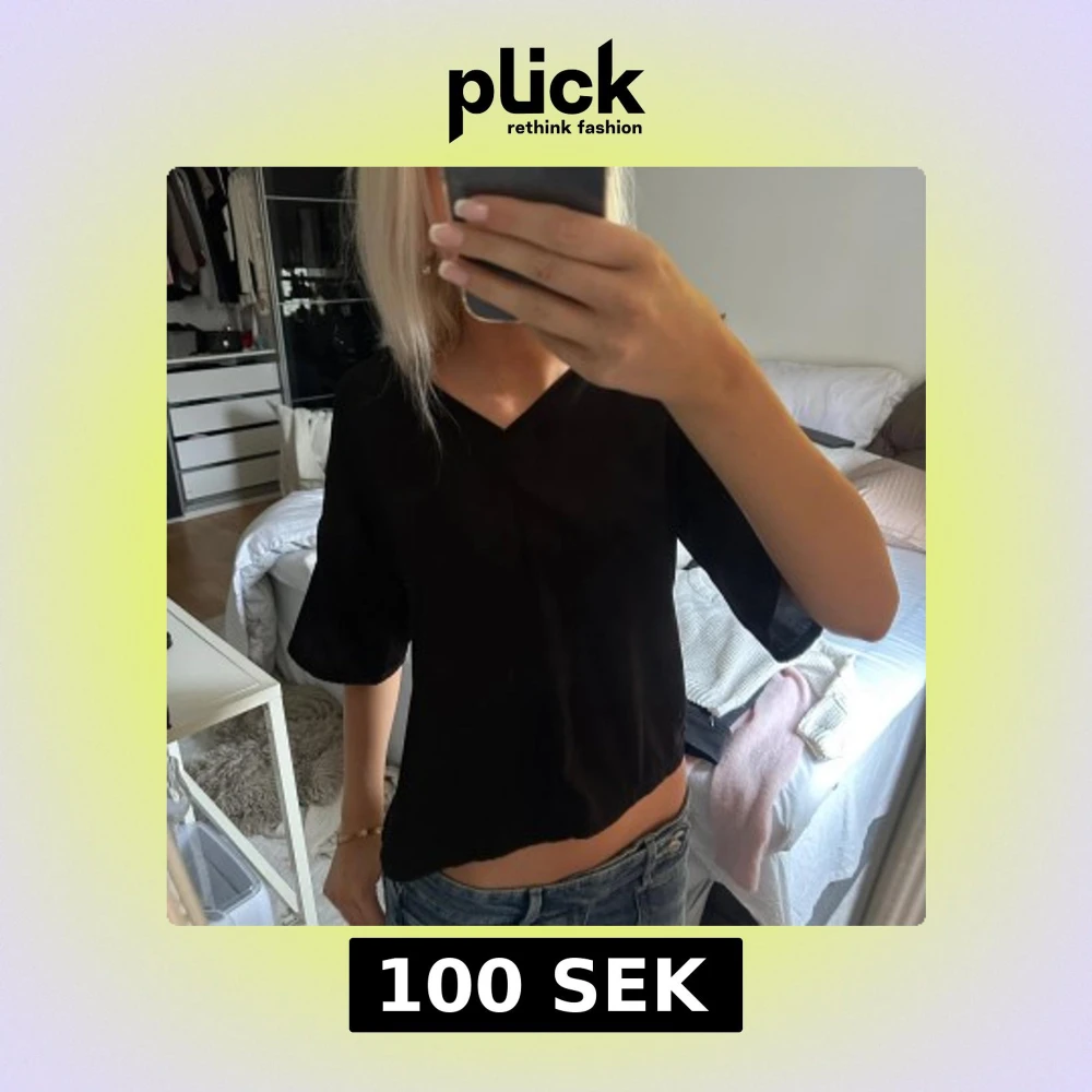 Svart blus från Lindex i storlek XS med v-ringad hals och vida, korta ärmar. Silkes material.