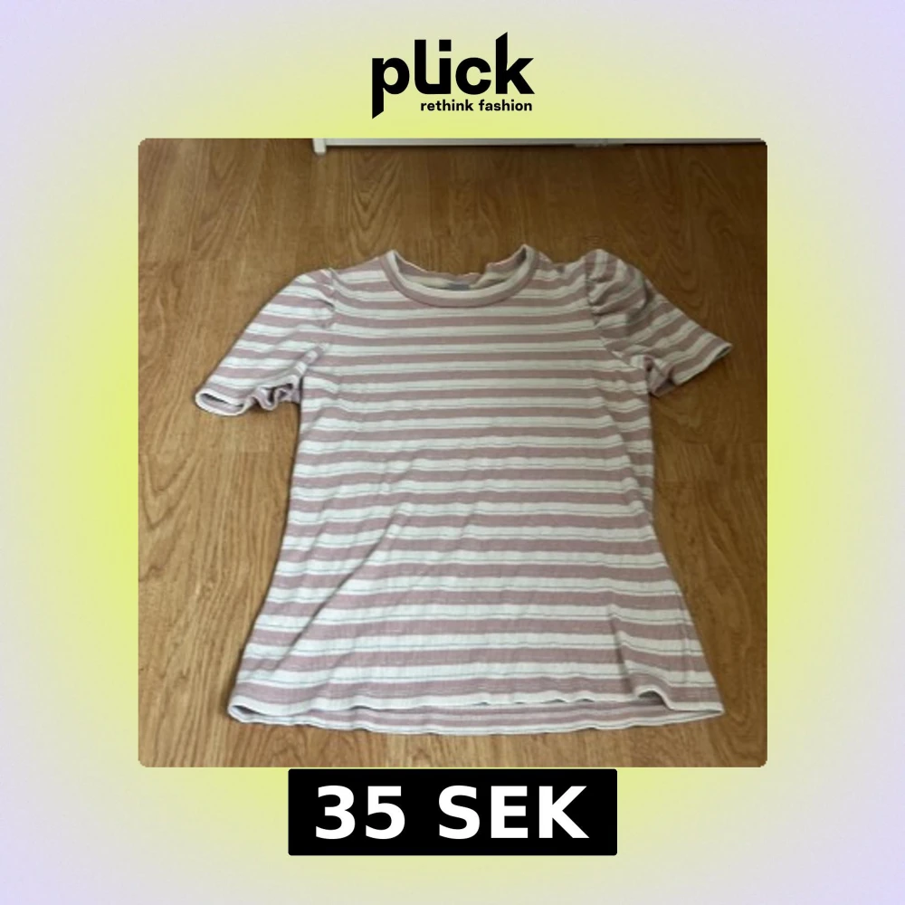 Säljer en söt randig topp i ljusrosa och vitt med korta puffärmar och rund hals. Materialet är ribbad bomull som ger en mjuk och skön känsla. Perfekt för dig som gillar en chill och feminin stil med lite retrovibe.