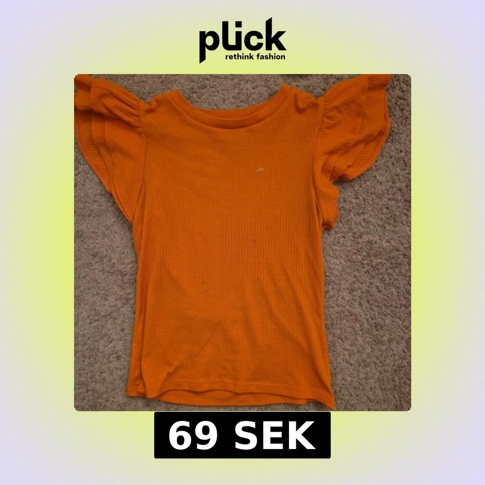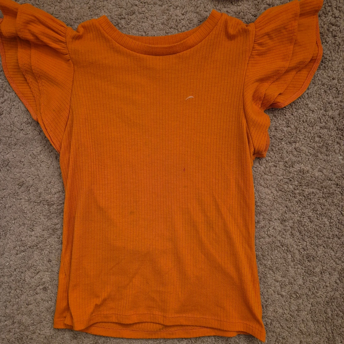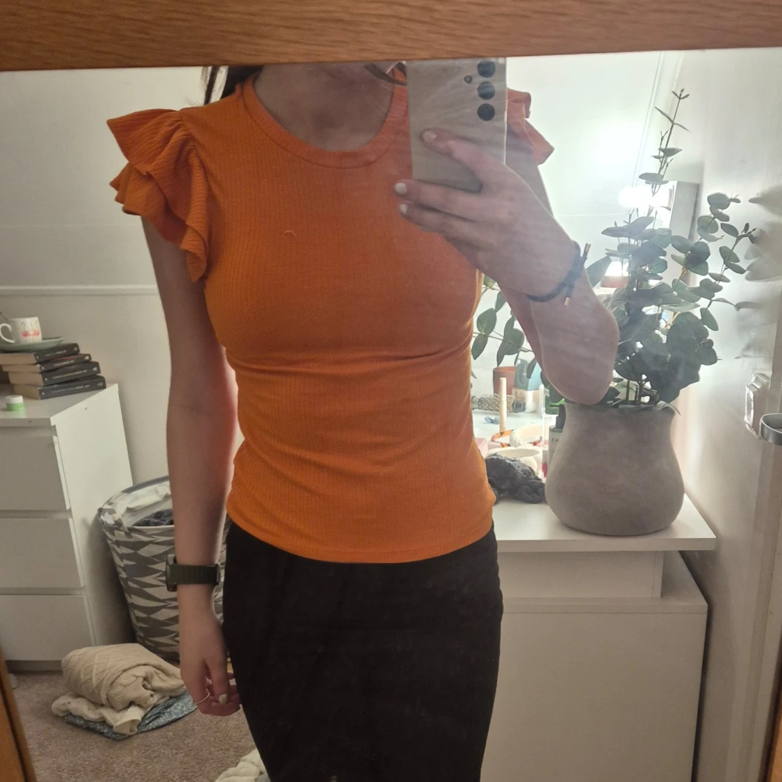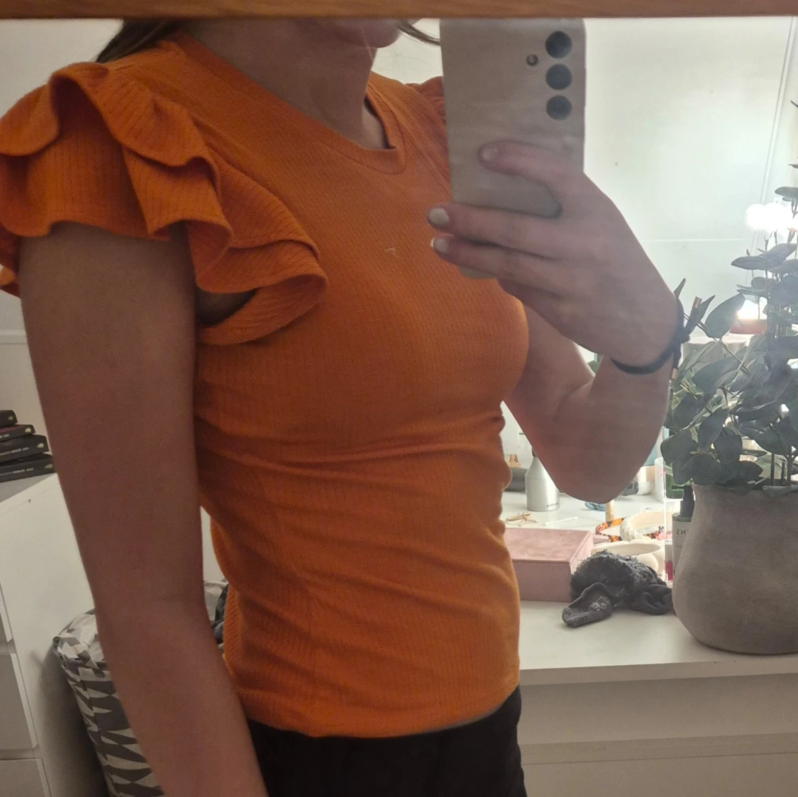Säljer en snygg orange ribbad topp med volangdetaljer på ärmarna. Toppen har en tight passform och är perfekt för att liva upp garderoben med lite färg.