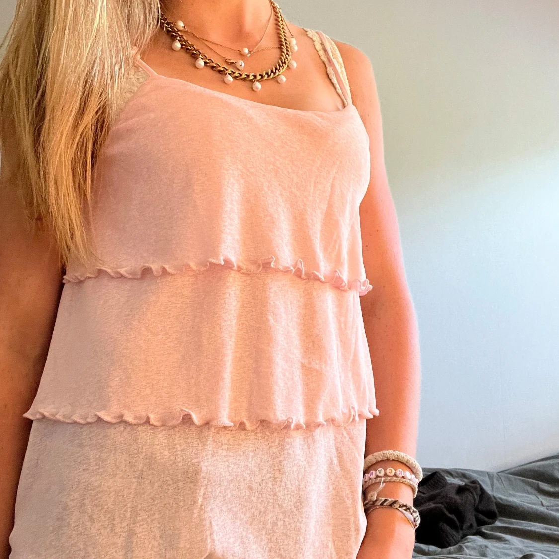 Supersöt ljusrosa linnetopp med volangdetaljer i flera lager och tunna axelband. Toppen har en luftig och flowy känsla, perfekt för varma dagar. Materialet känns mjukt och lätt mot huden. Enkel att styla med smycken❤️