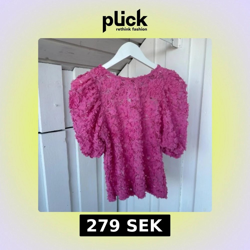 Superfin rosa blus från lindex med 3D-blommor i spets och korta puffärmar. Blusen har rund halsringning och knäppning bak i nacken. Perfekt för dig som vill sticka ut med en färgstark och detaljerad topp.