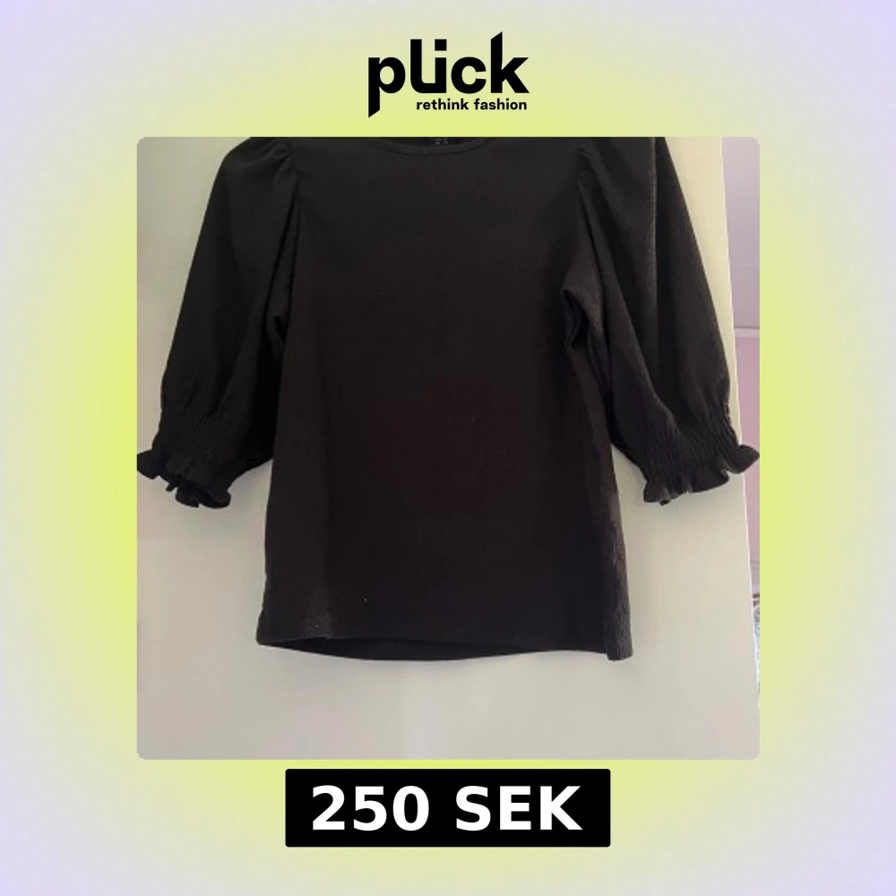 Svart blus från Lindex i storlek XS med puffiga trekvartsärmar och smockdetaljer vid ärmslut. Toppens tyg har en lätt struktur och rund halsringning. Perfekt för dig som gillar stilrena och trendiga plagg med lite volym i ärmarna. 🩵🩵🩵