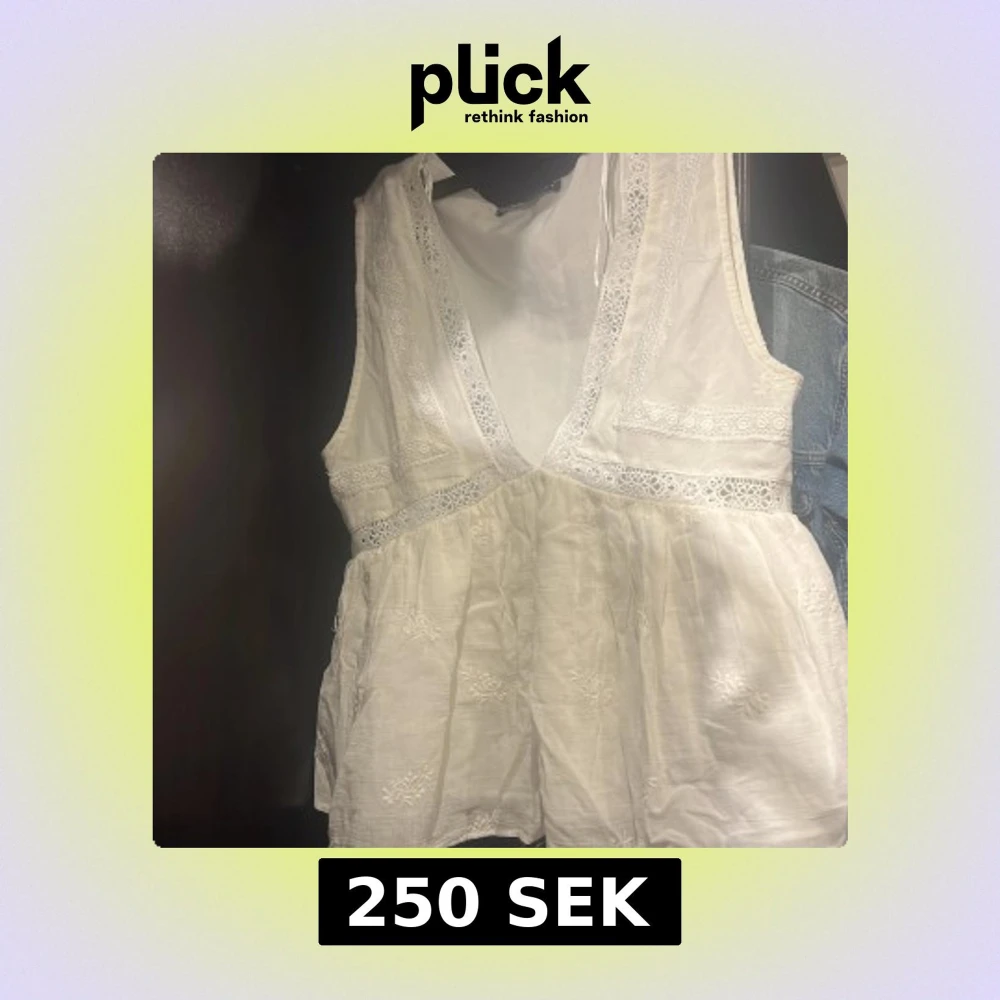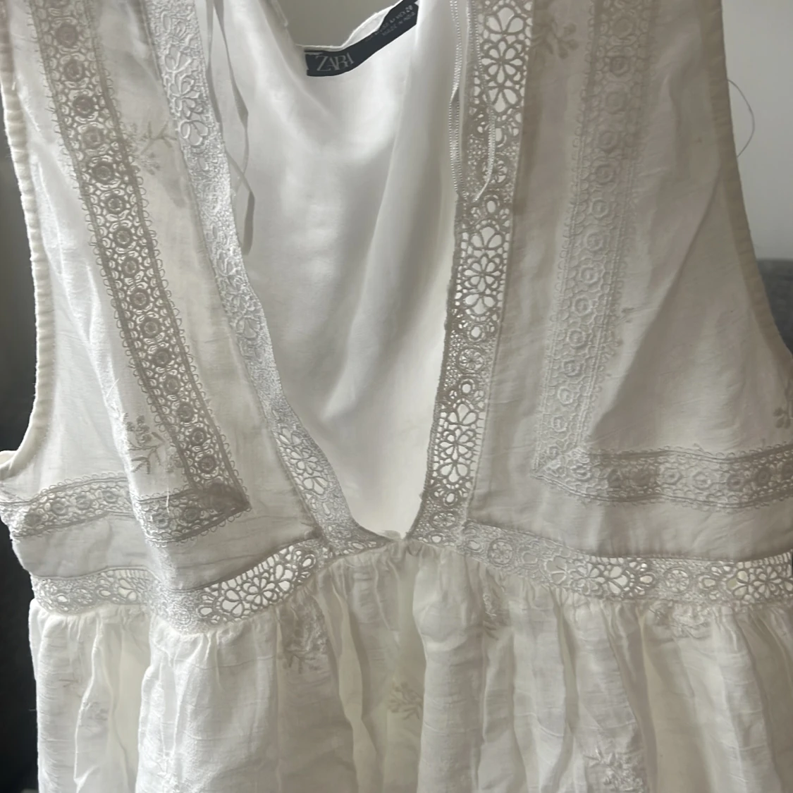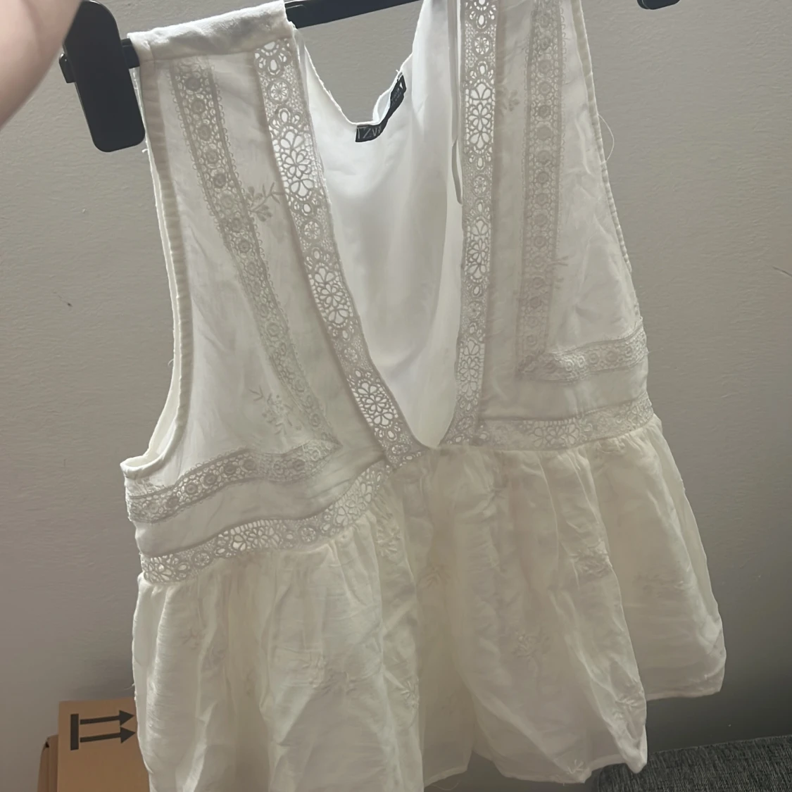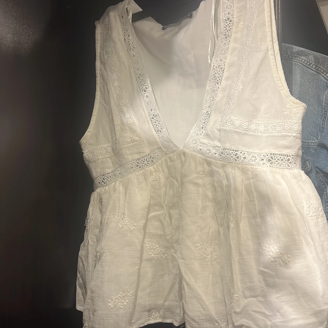 Supersöt vit blus från Zara med djup v-ringning och broderade detaljer. Blusen är ärmlös och har spetsinslag längs ringningen och midjan. Den har en lätt volang nedtill och är gjord i ett tunt, luftigt bomullstyg. Perfekt för en fräsch och romantisk look.❤️storlek M men passar mindre