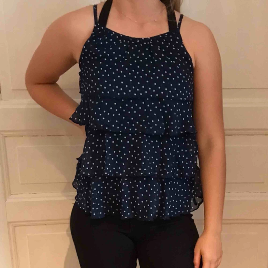 Fint blått linne med vita prickar. Flera volanger, passar en S