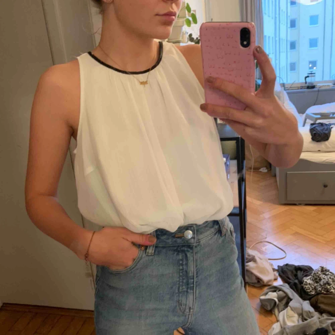 Vit topp i chiffong med en kant i svart skinnimitation kring halsen. Priset är exklusive frakt.