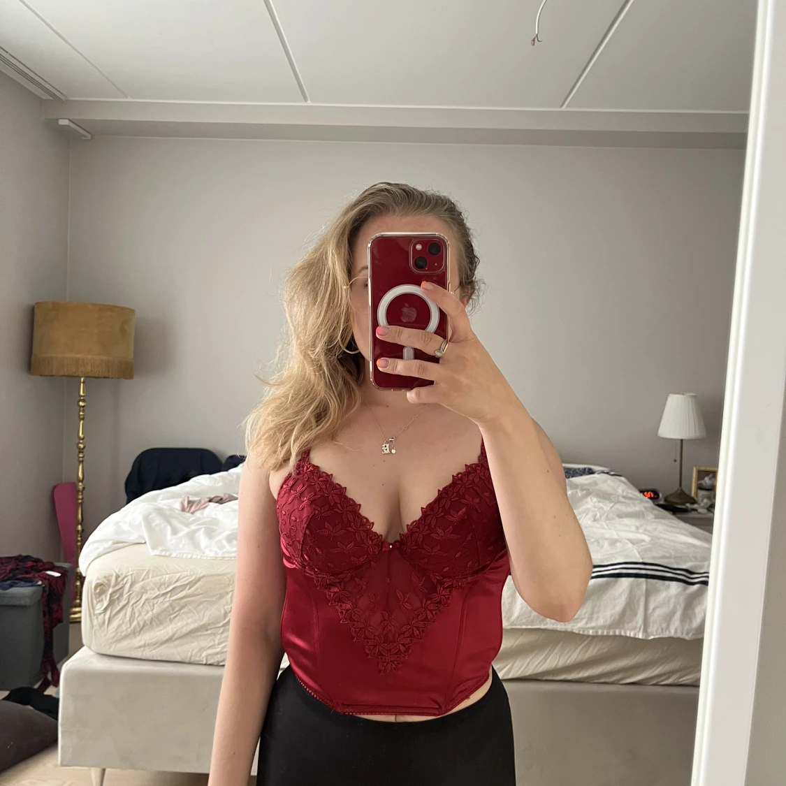 Fin vinröd vintage korsett topp köpt från Plick men kommer inte till användning. Den passar bäst en person som har C-DD kupa och är längre än 160cm.