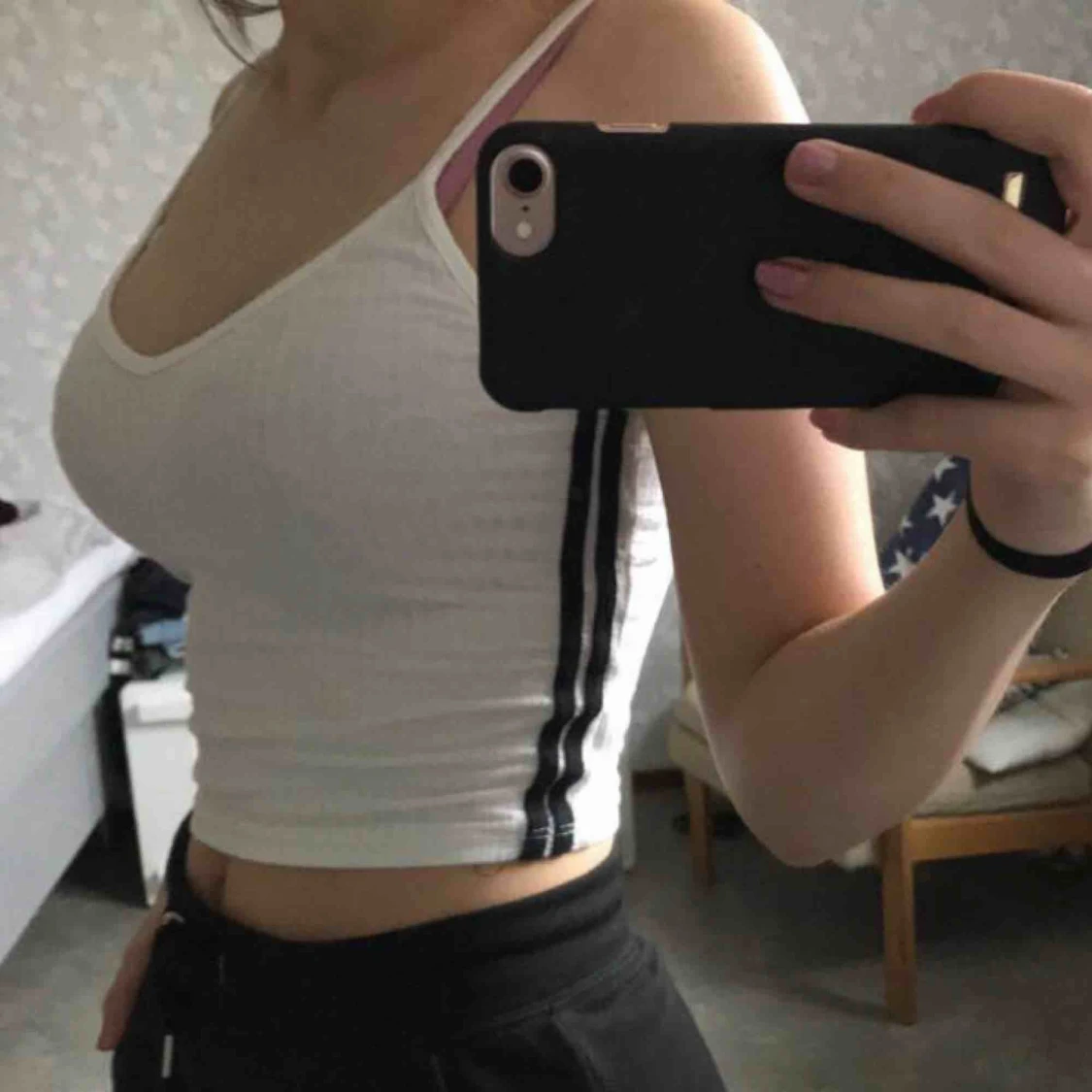 Vitt linne med två svarta sträck på båda sidorna Bra skick! Frakt tillkommer men pris kan diskuteras✨