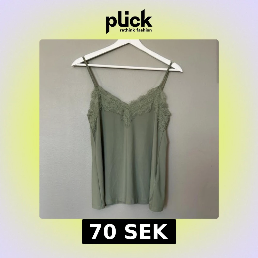Supersöt ljusgrön linnetopp med tunna axelband och v-ringning. Toppen har fina spetsdetaljer längs urringningen🍀