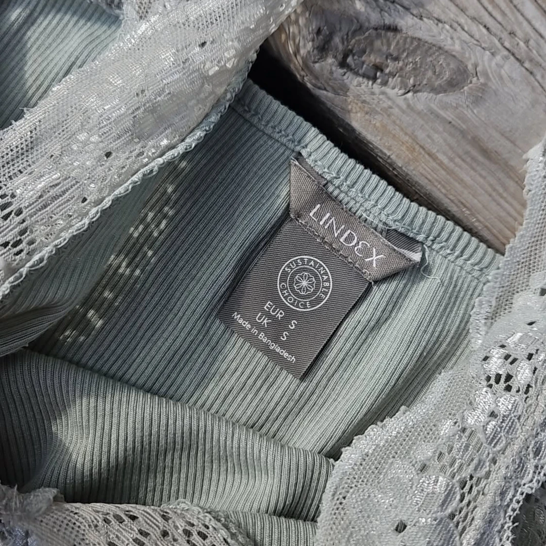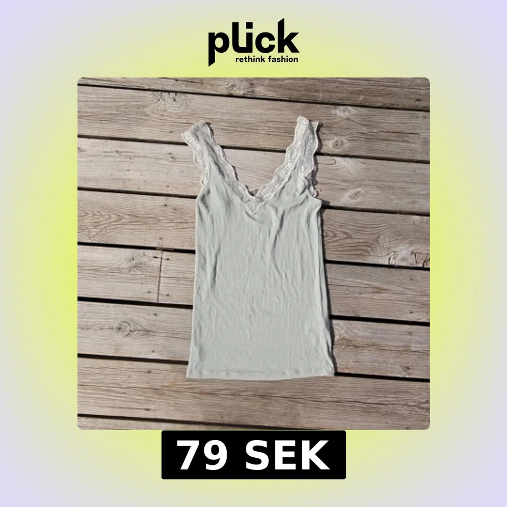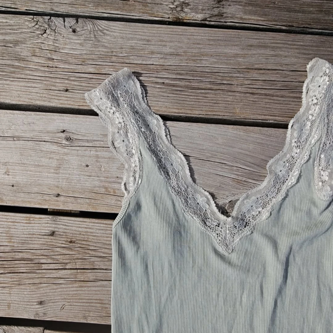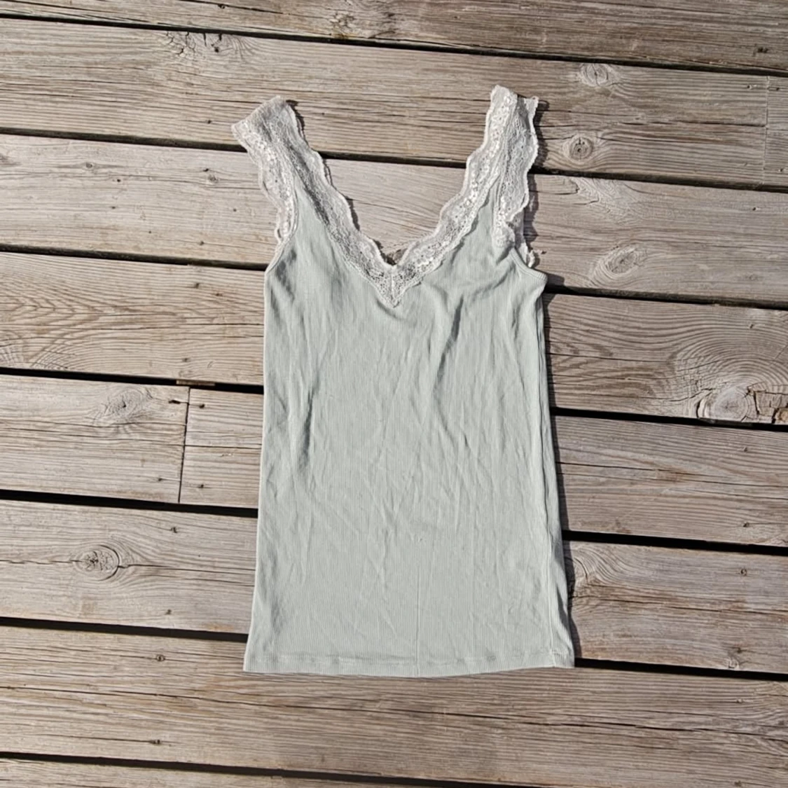 Ett grönt ribbat linne med jätte fin vit spets från Lindex! Stilrent, gulligt funkar till absolut allt. Fint skick, använd nå gånger. Storlek S (eu 36), däremot väldigt stretchig passar nog xs-m (eu 34-38)