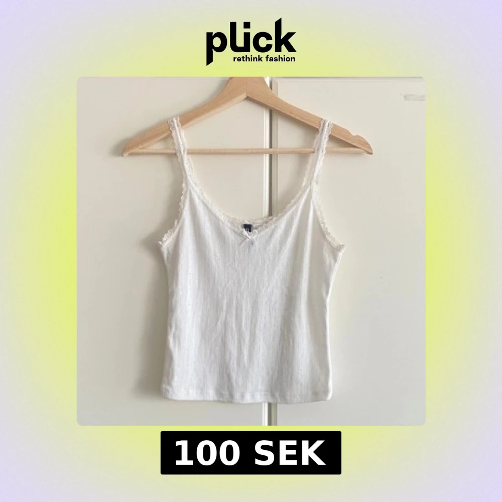 Supersöt vit linnetopp med smala axelband och spetskant längs ringningen och banden. Toppen har en liten rosett framtill och ett diskret mönster i tyget som ger en romantisk känsla. Perfekt att styla med jeans eller kjol för en fräsch look.