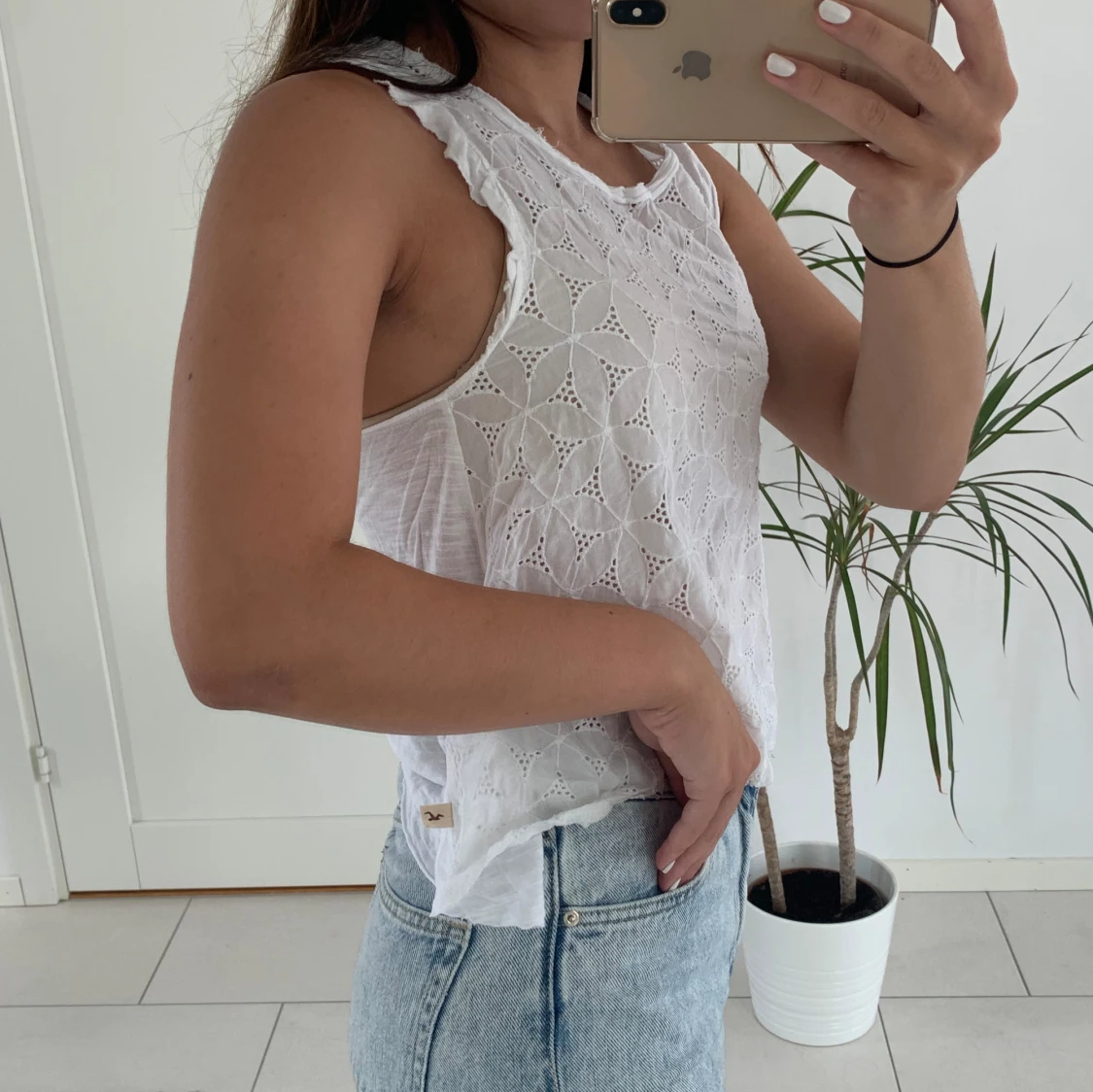 Jättefin vit topp med blommönster perfekt till sommaren!💘 Från Hollister, strl XS