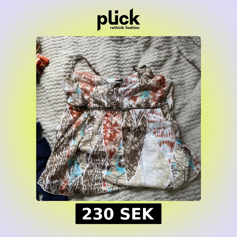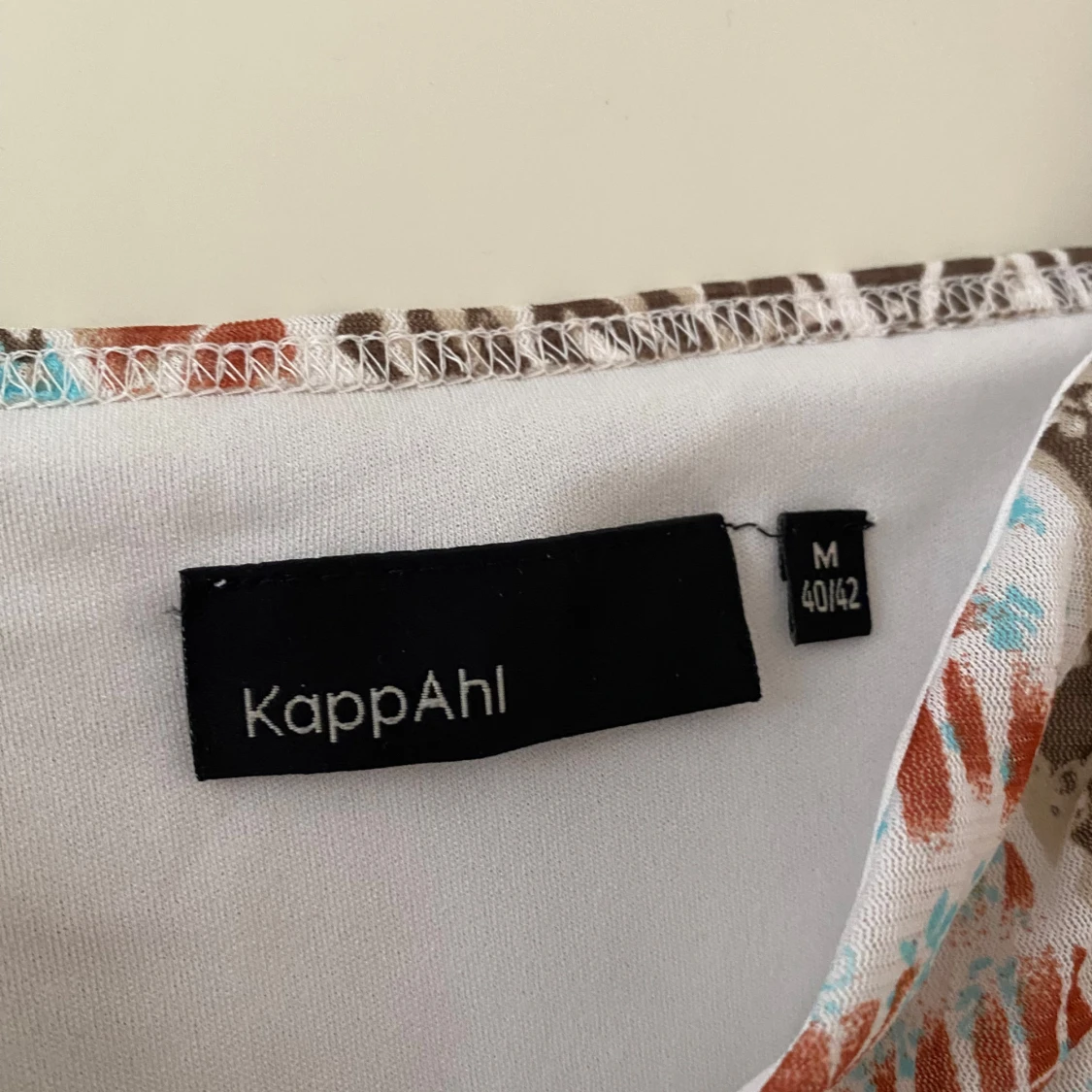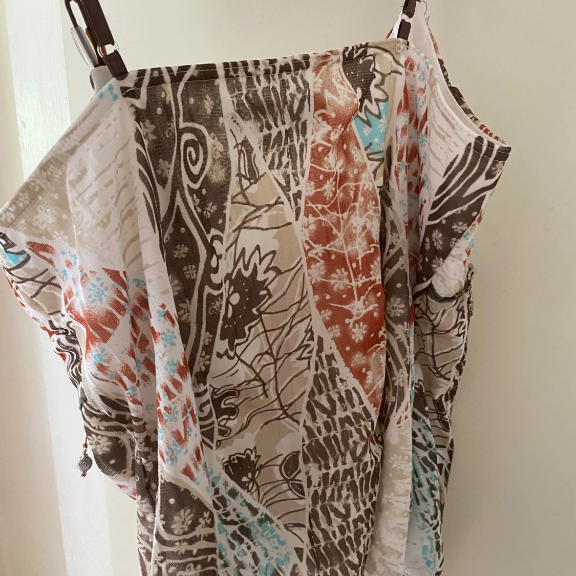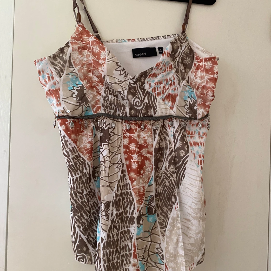 Säljer en luftig linnetopp från KappAhl med smala axelband. Toppen har ett färgstarkt mönster i brunt, vitt, orange och turkost med blommor och blad. Enkel att matcha med jeans eller kjol.