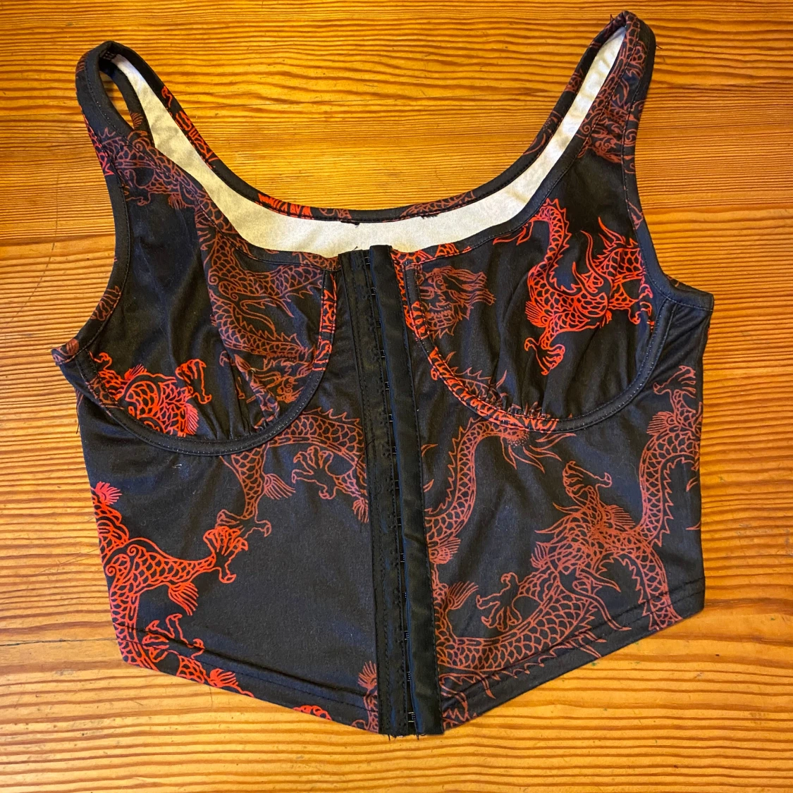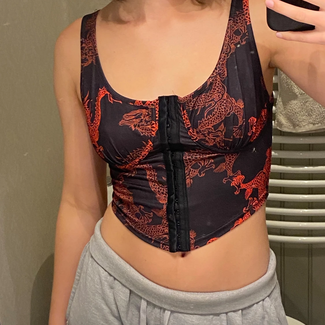 Coolt korsettaktigt linne med drakmönster. Står ingen storlek men skulle säga ungefär S. Har själv inte använt mycket, men köpt second hand.
