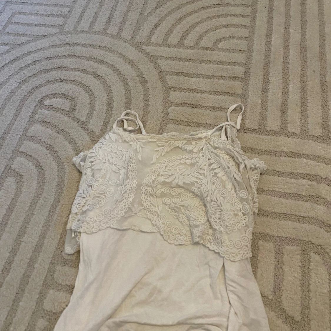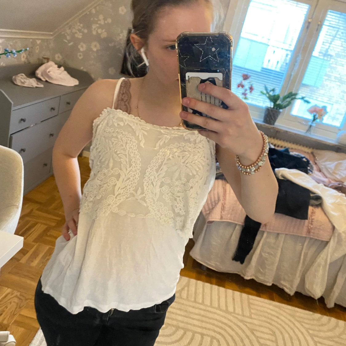Säljer en söt vit linnetopp med tunna axelband och vackra spetsdetaljer framtill. Perfekt för varma dagar eller som ett lager under en kofta. Toppen har en avslappnad passform och fina broderade mönster på bröstet.