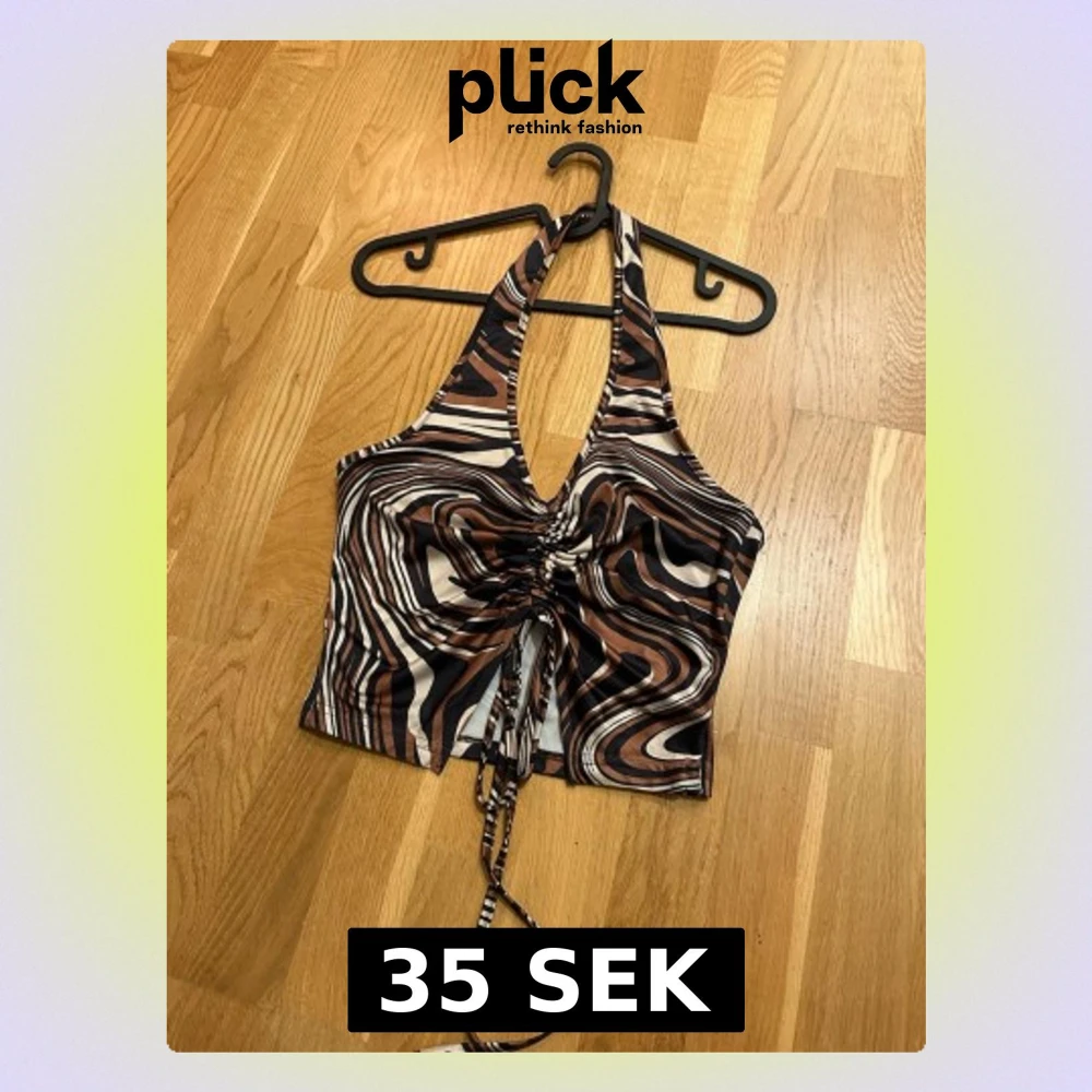 Säljer en snygg topp med abstrakt mönster i brunt, svart och vitt. Toppen har snörning framtill som ger en cool rynkad effekt och croppad passform. Materialet är mjukt och stretchigt, perfekt för att styla med jeans eller kjol eller till fest.