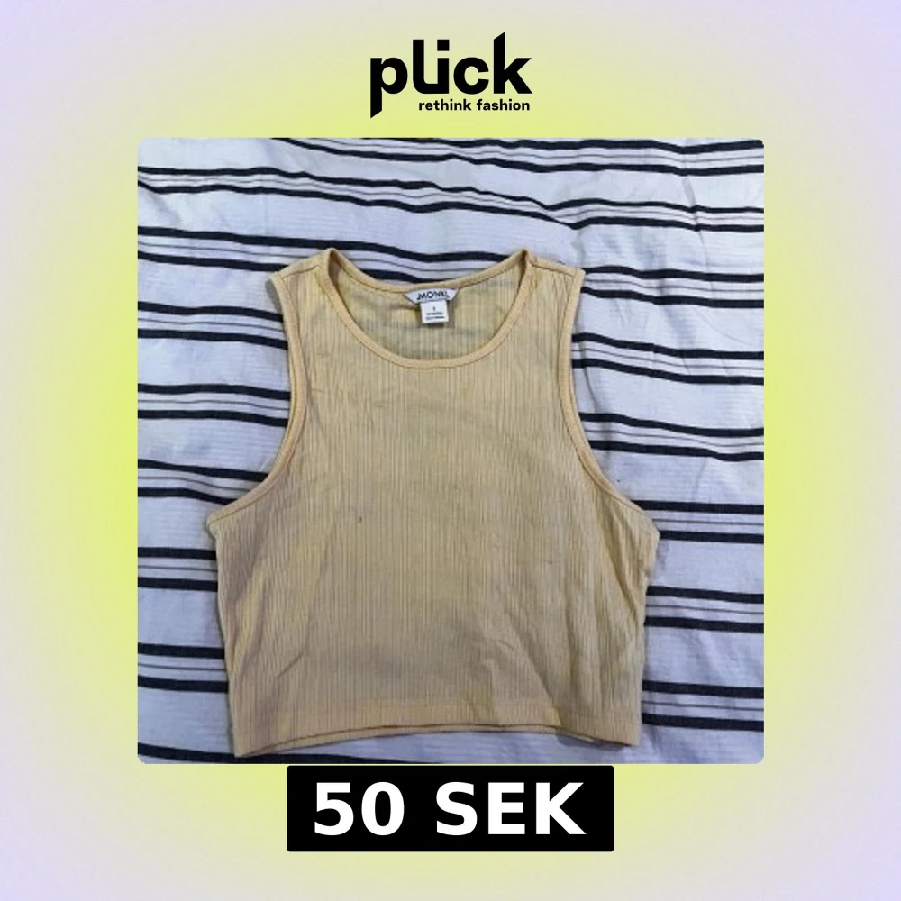 Säljer en gul ribbad linnetopp från Monki. Toppen är ärmlös och har en enkel, stilren design som passar perfekt för varma dagar. Perfekt att matcha med jeans eller kjol för en avslappnad look.