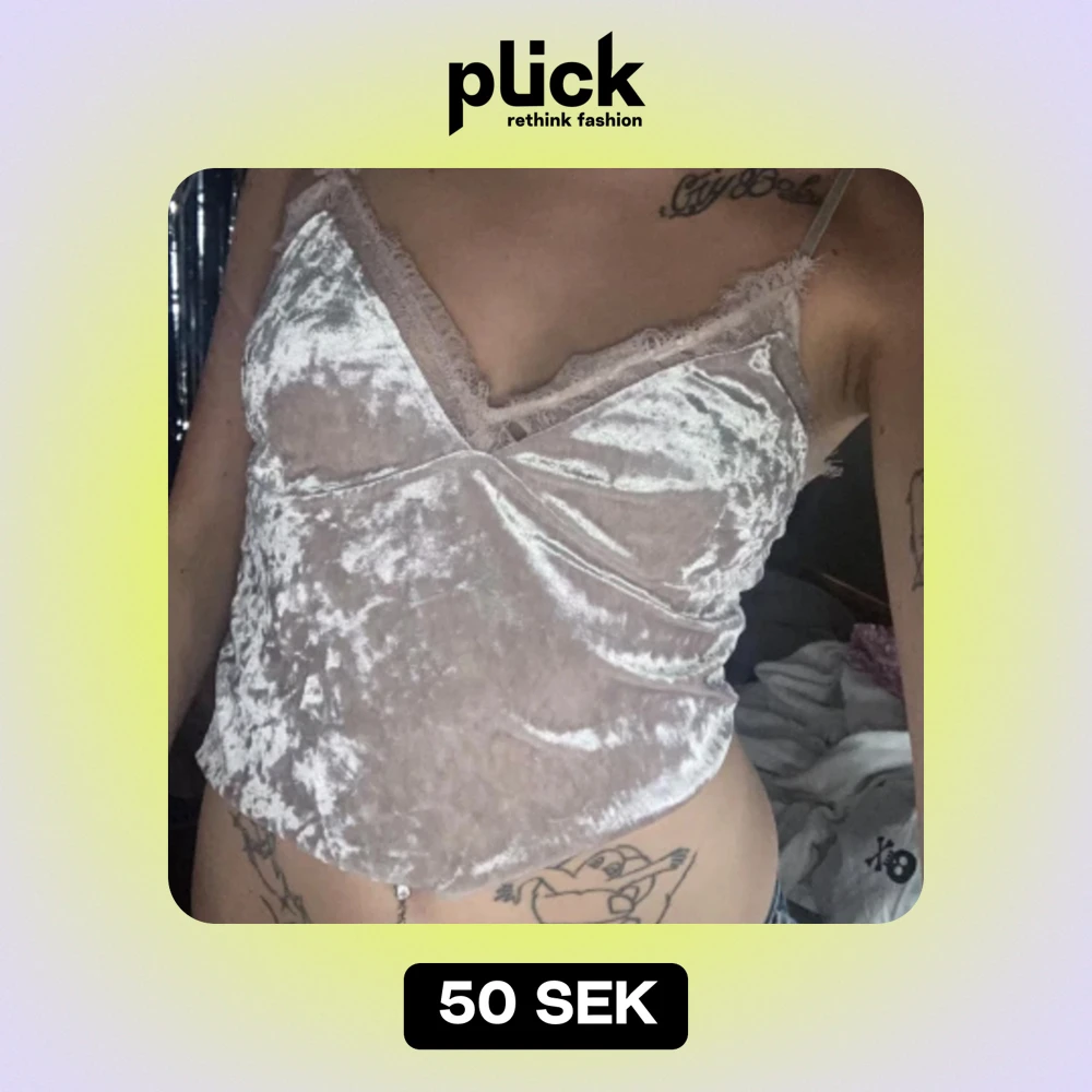 Ett sammetslinne i rosa som är cropped, sitter perfekt på mig 170cm och 60kg. Aningen slitet vid ”kragen” men tycker det ser snyggt ut!