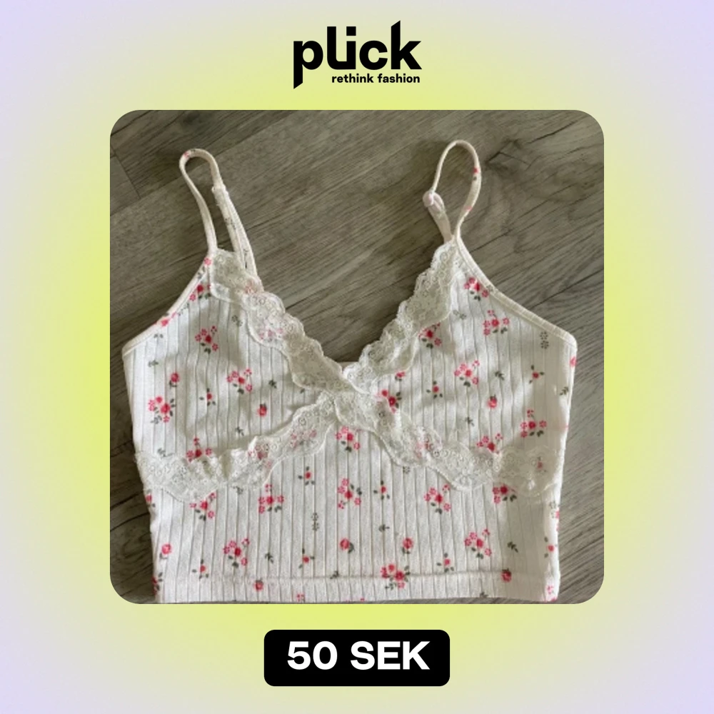 Ett vit/rosa linne med blommor på, kortare i modellen.