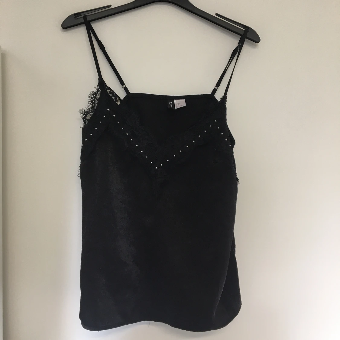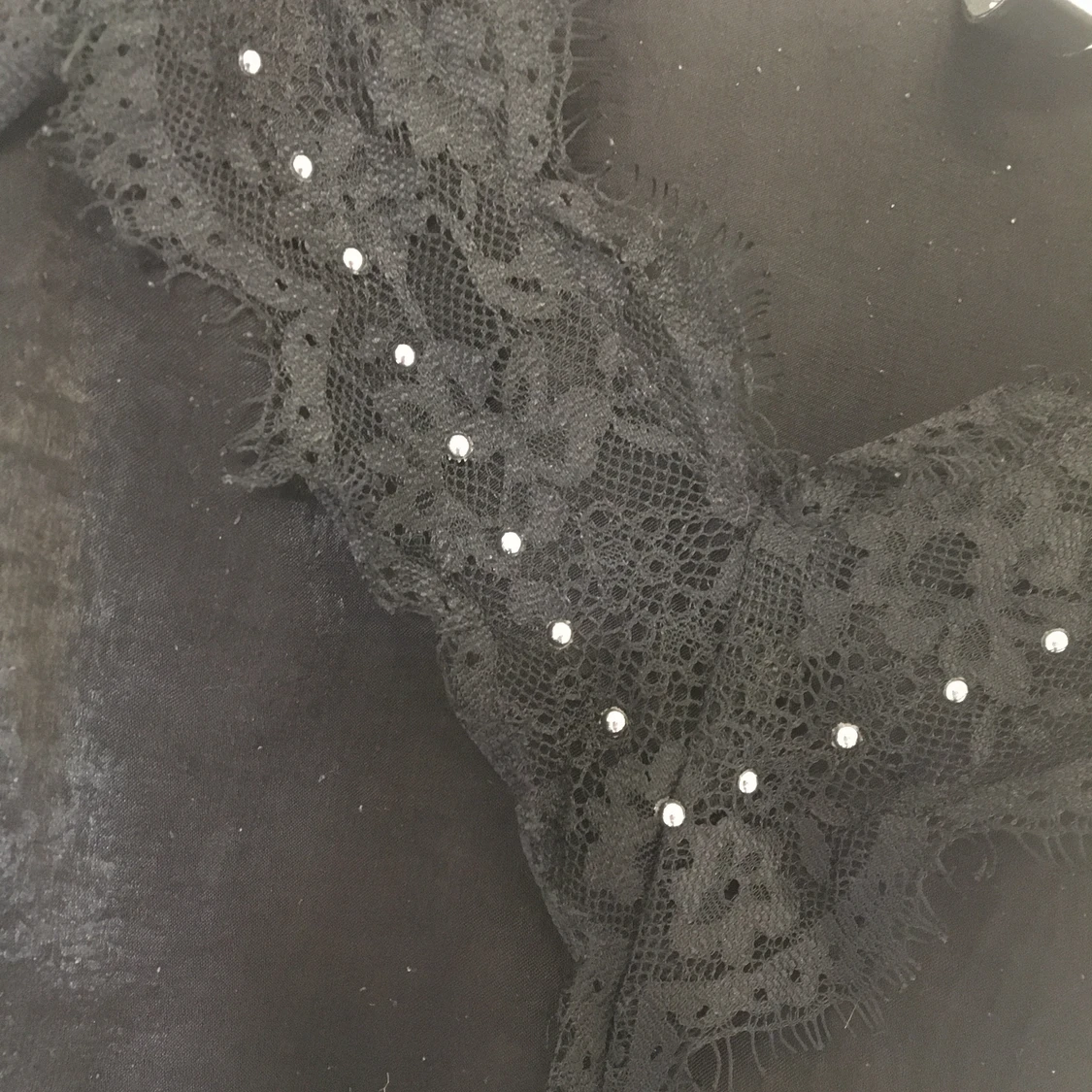 Svart linne med spets och stenar framtill. Storlek XS men passar S också.