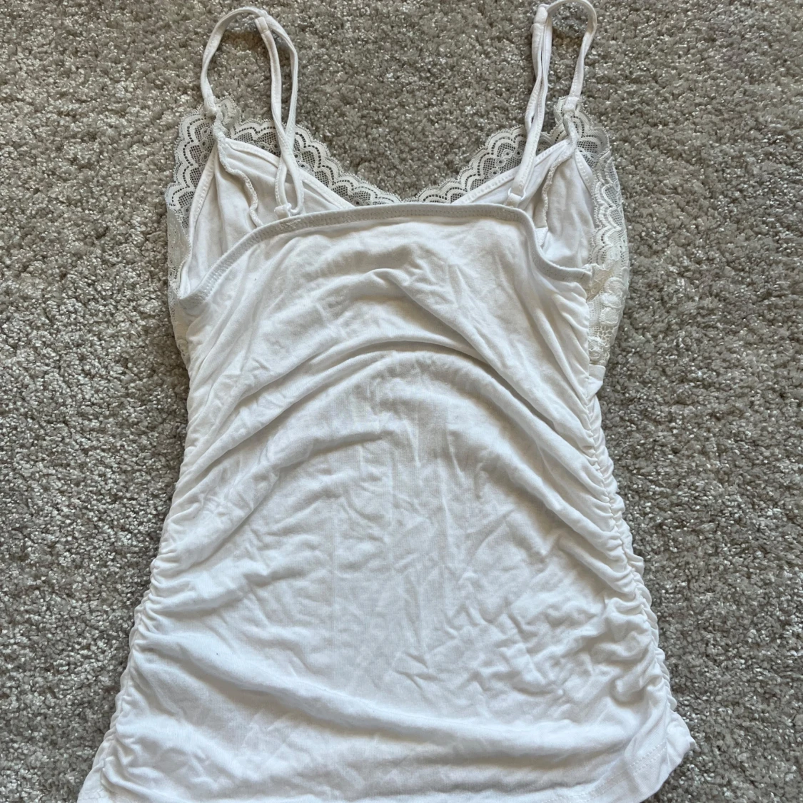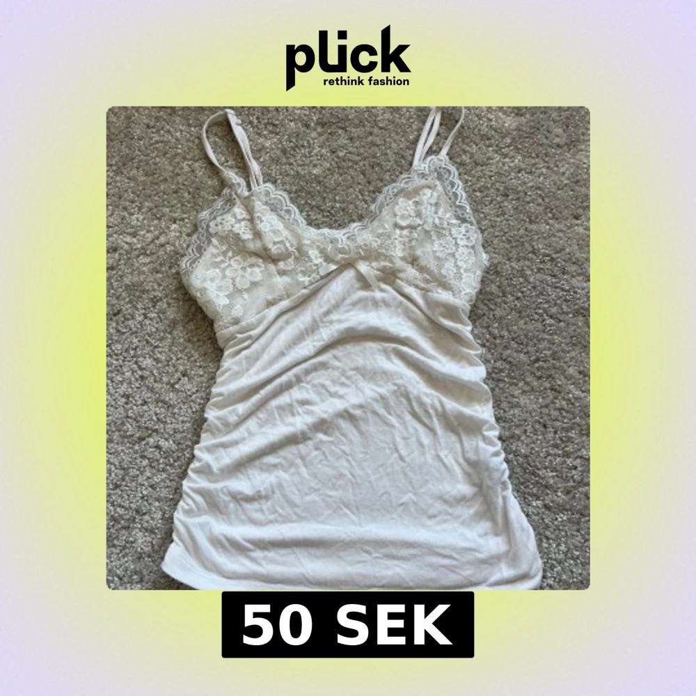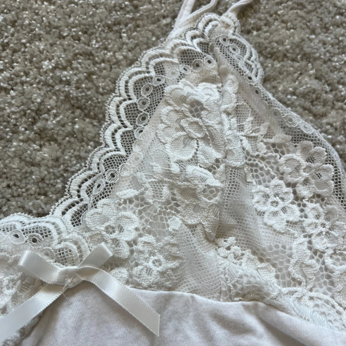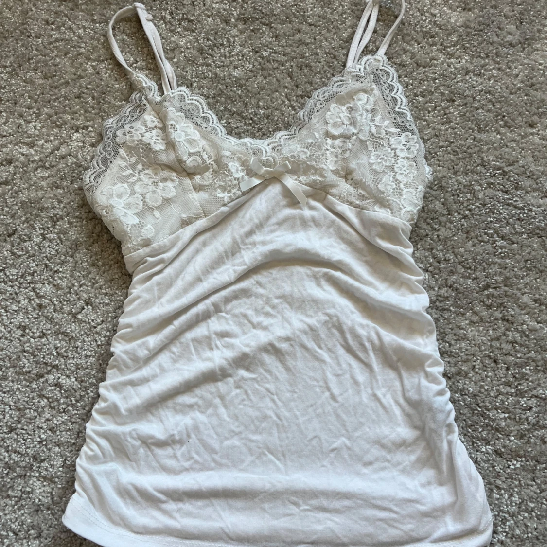 Säljer ett vackert vitt linne med spetsdetaljer och blommönster. Linnet har smala axelband och en söt rosett framtill. Perfekt för en romantisk look eller som ett lager under andra plagg. Använd fåtal gånger 💕