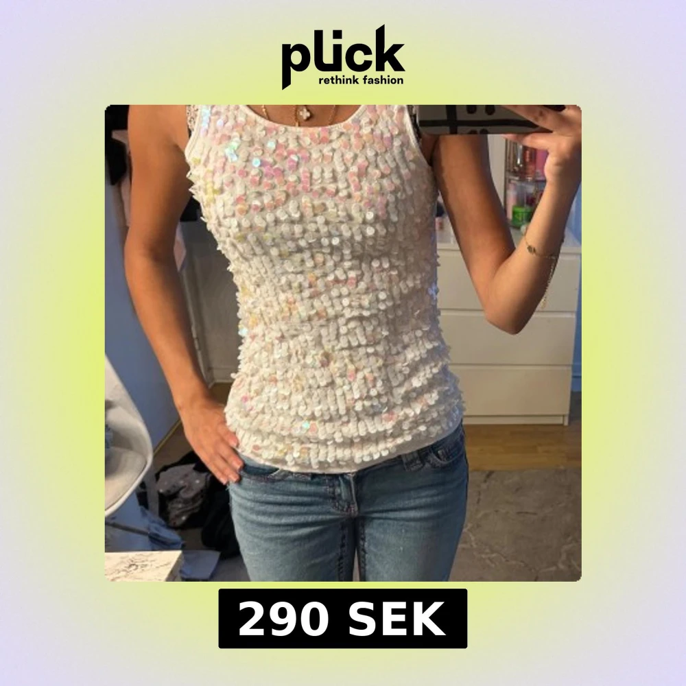 Supersnygg vit linnetopp, täckt med skimrande paljetter som reflekterar i regnbågens färger. Perfekt för fest🫶🏽