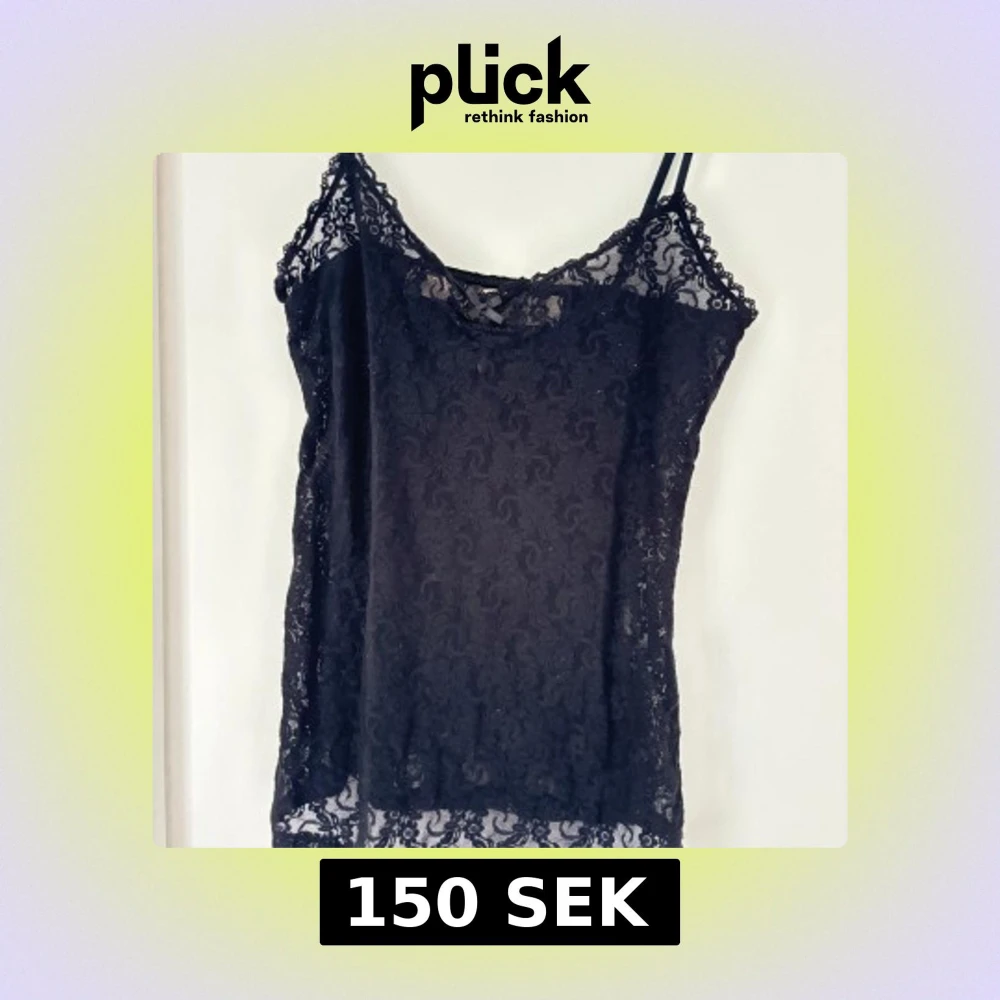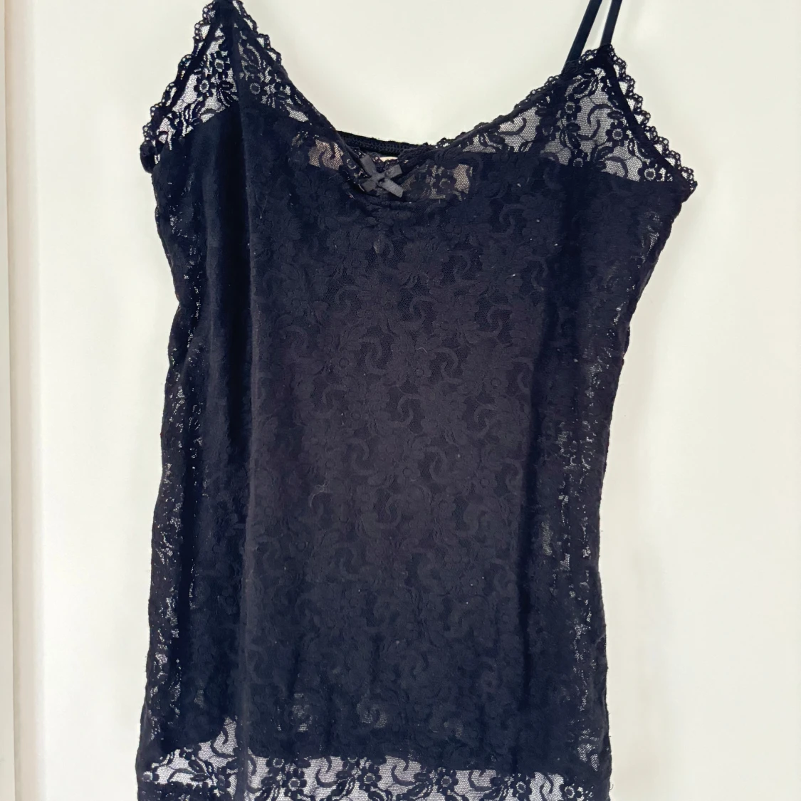 Svart linnetopp med tunna axelband och helspets i ett snyggt blommigt mönster. Toppen har en liten rosett framtill och är genombruten med transparenta detaljer. Perfekt för dig som gillar en feminin och trendig look.