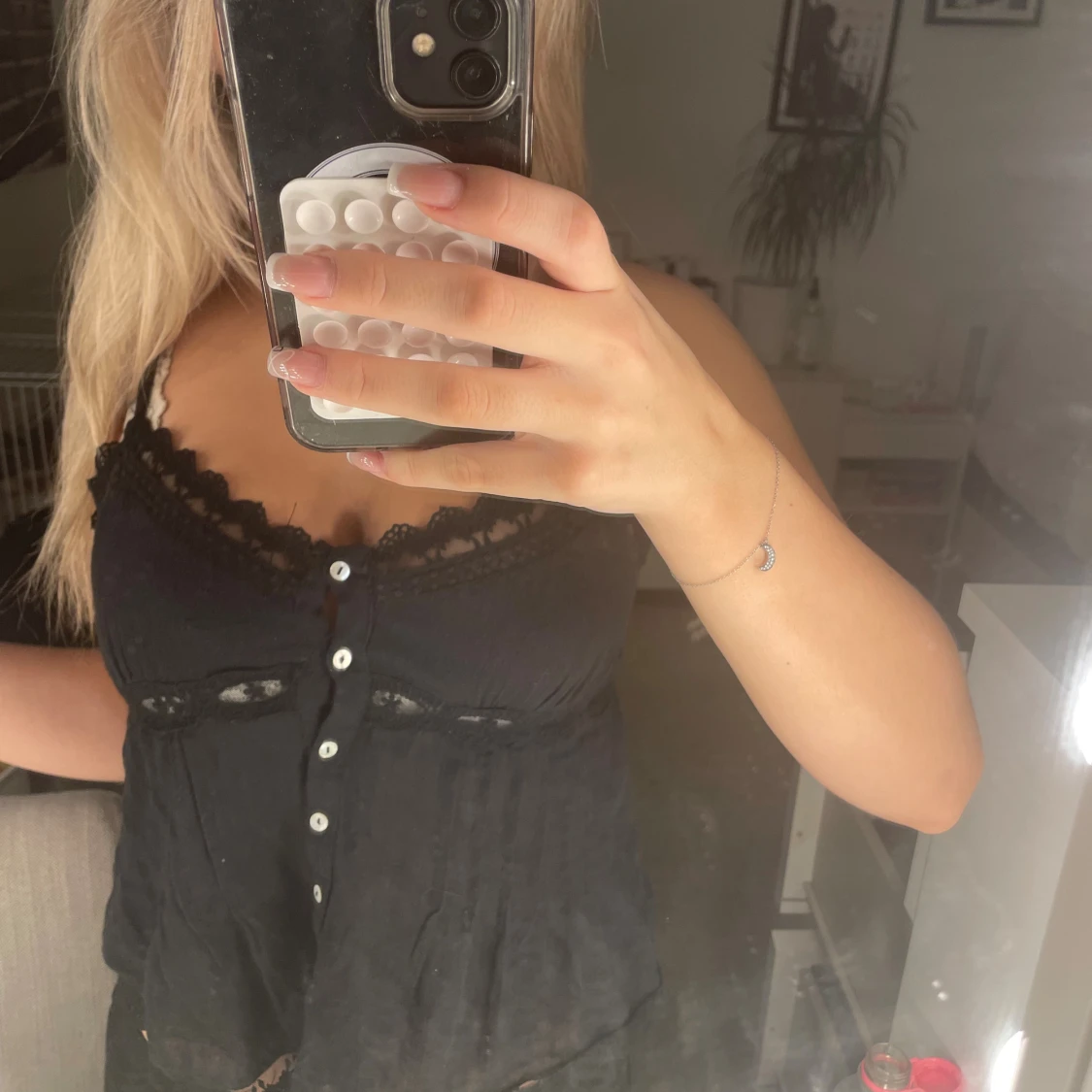 Säljer en svart linnetopp med spetskant och dekorativa vita knappar framtill. Toppen har v-ringad hals och fina spetsdetaljer både vid halsen och under bysten