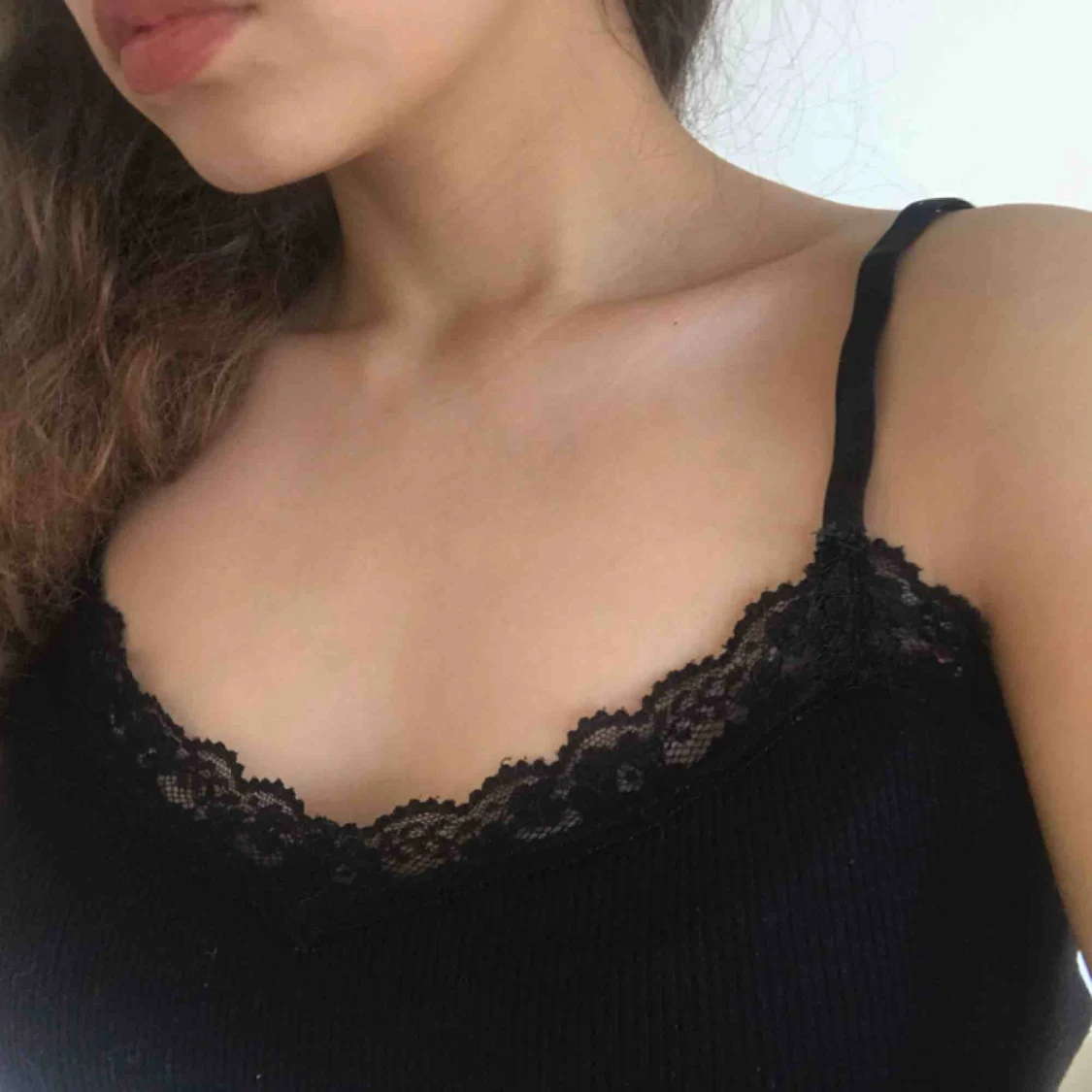 Svart spetslinne med både spets uppe och nere, linnet har en v urringning och är gjort av skönt och elastisk material i storlek XS. Pris: 60 kr (frakt ingår)