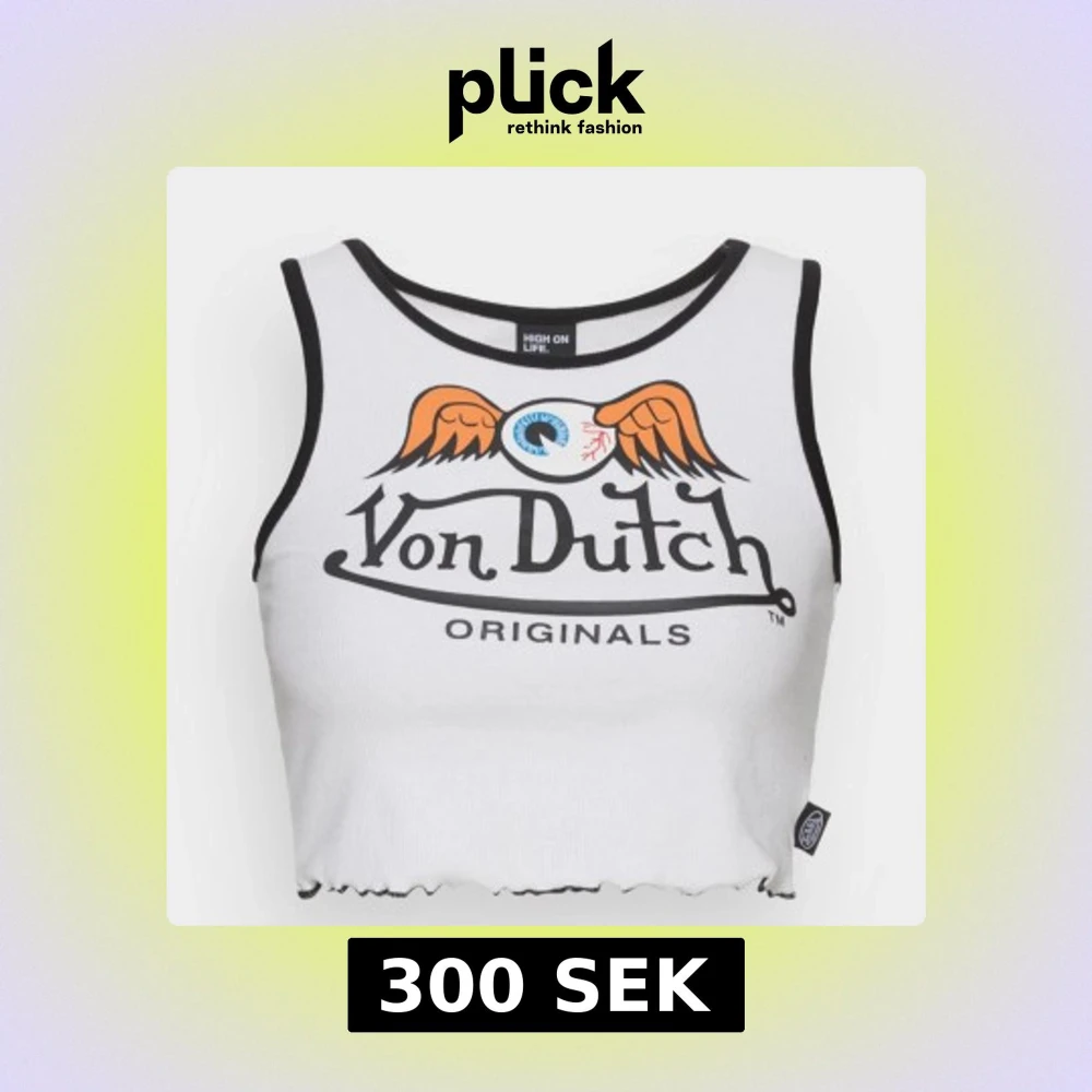 Säljer en cool vit croppad linnetopp från Von Dutch med svart kant och ett stort tryck av logotypen framtill. Toppen har ett unikt motiv med ett öga och vingar i orange och blått. Perfekt för en avslappnad stil!, Köpt för 495kr plus frakt och säljer för 300kr då den är helt ny och oanvänd. Står storlek XL men skulle säga att den är mer som M-L.