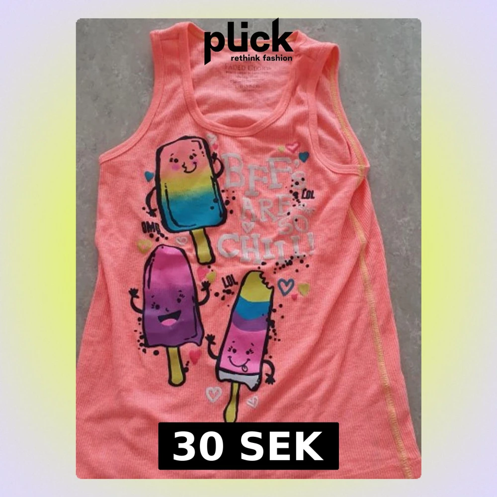 Säljer en orange/Korall ribbad linnetopp från Faded Glory med färgglatt glassmotiv och texten 'BFFs are so chill!'. Toppen är ärmlös och har söta hjärtan och glada glassfigurer på framsidan. Perfekt för sommarens varma dagar.