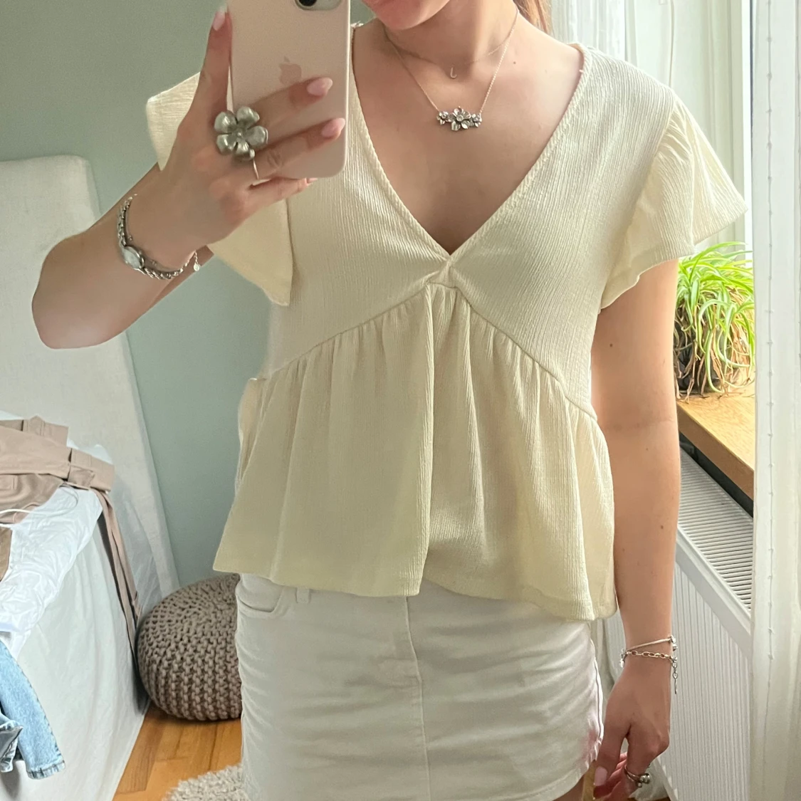 Supersöt ljusbeige blus med v-ringad hals och volang nedtill från GinaTricot!🫶🏻