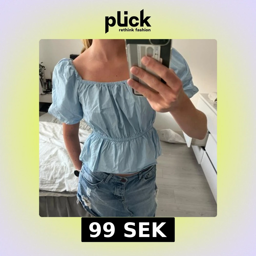 Supersöt ljusblå blus med puffiga korta ärmar och smock i midjan som ger en fin volang. Fyrkantig ringning och luftig bomullskänsla, perfekt för varma dagar. Enkel att styla med jeans eller kjol för en fräsch look.