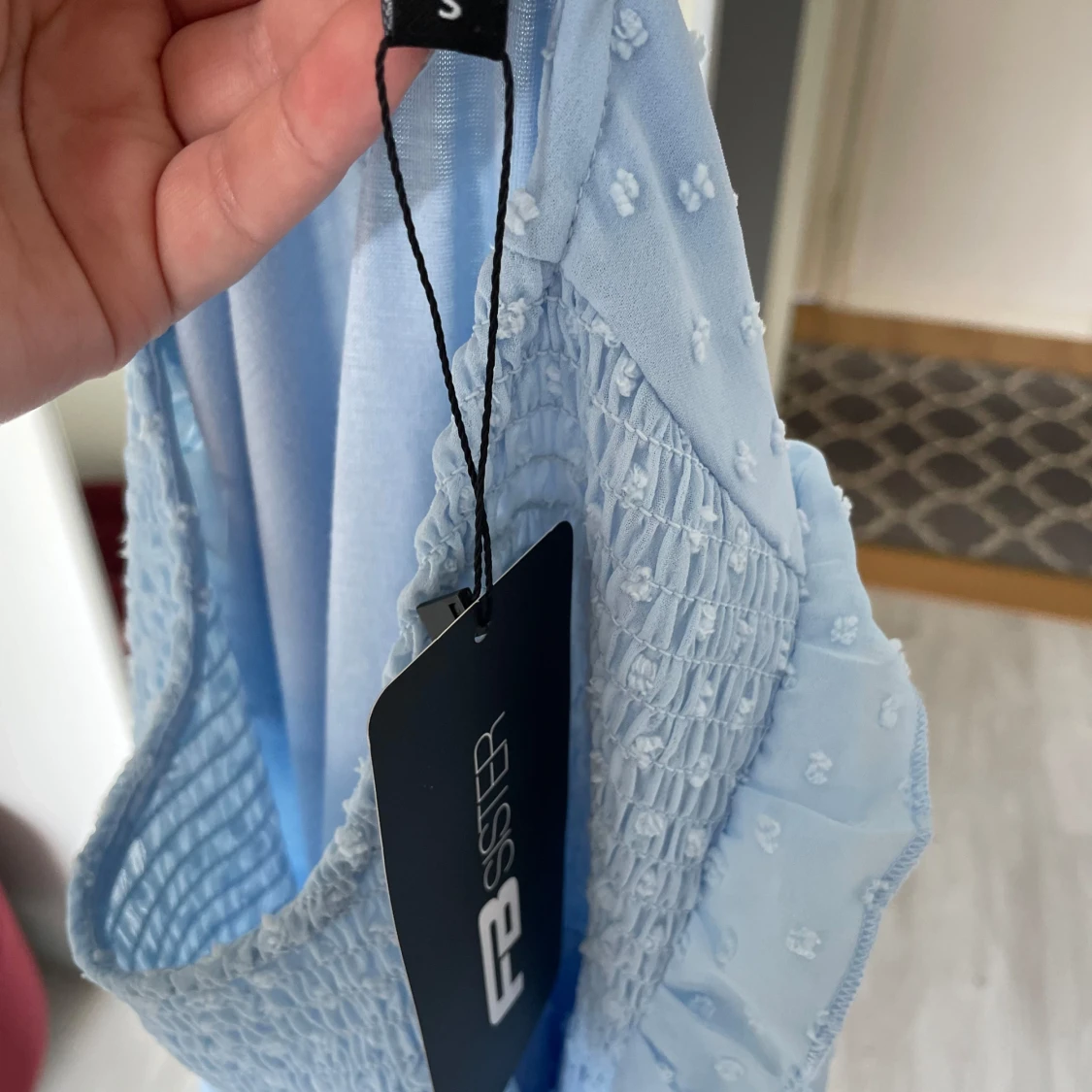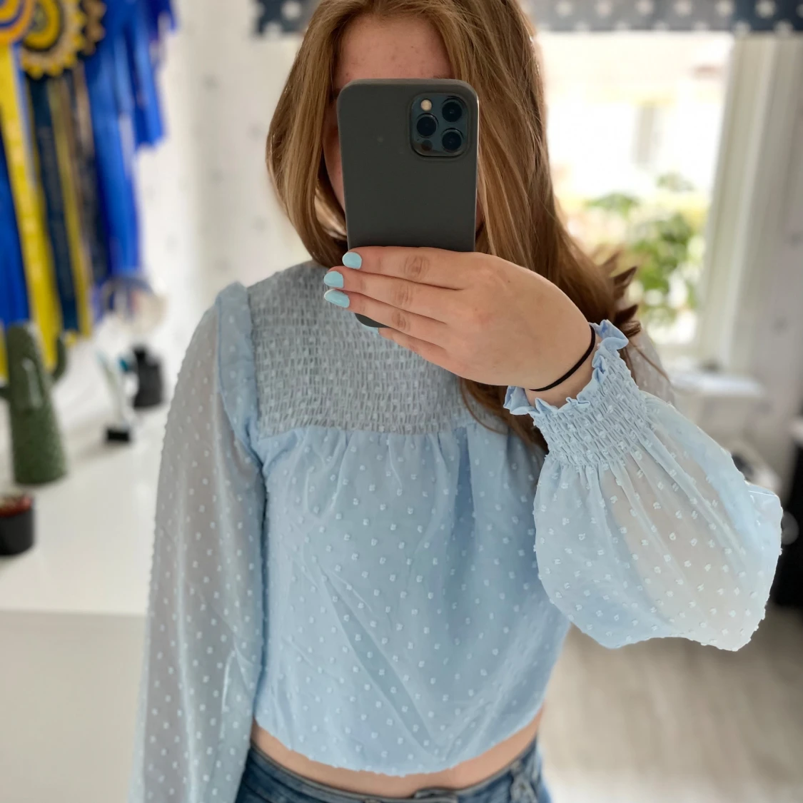 Supersöt ljusblå blusen prislapp kvar. Med smock upptill, transparenta puffärmar och diskret prickigt mönster. Croppad modell med volangdetaljer vid axlar och ärmslut. Perfekt för dig som gillar romantisk och trendig stil. Svalt och skönt material som tyvärr aldrig kommit till användning. Storlek S